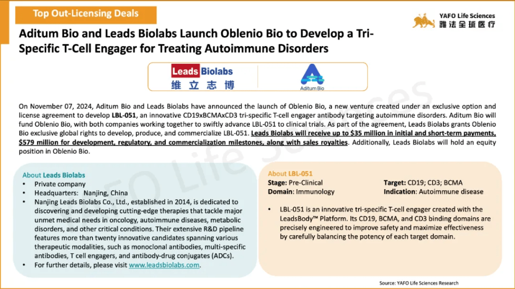 本周中国市场最引人注目的出海交易是维立志博授予Oblenio Bio公司,一家与Aditum Bio联合成立的NewCo,三特异性抗体LBL-051的独家选择和许可权,首付款3500万美元,总价值6.14亿美元,以及Oblenio Bio公司股权。本周国内交易迎来高峰,达成了7项合作和许可协议。