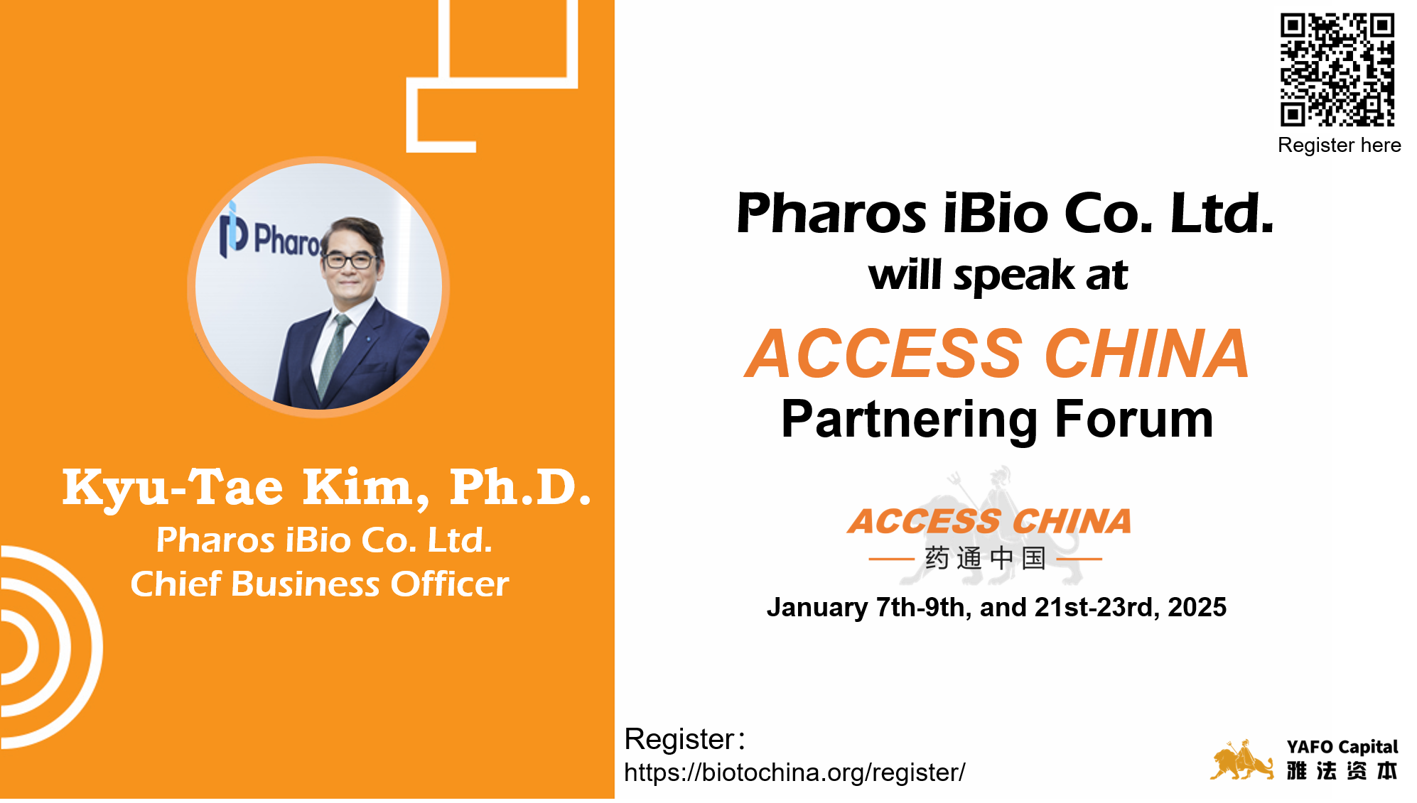 December 4th, 2024 (Shanghai) — We are glad to announce that Kyu-Tae Kim, Ph.D., the Chief Business Officer of Pharos iBio Co. Ltd., will be presenting at the ACCESS CHINA Partnering Forum @ JPM on January 7th-9th, and 21st-23rd, 2025. ACCESS CHINA Biotech Forum is the largest corporate access event between Asia and the Western biopharma industry.