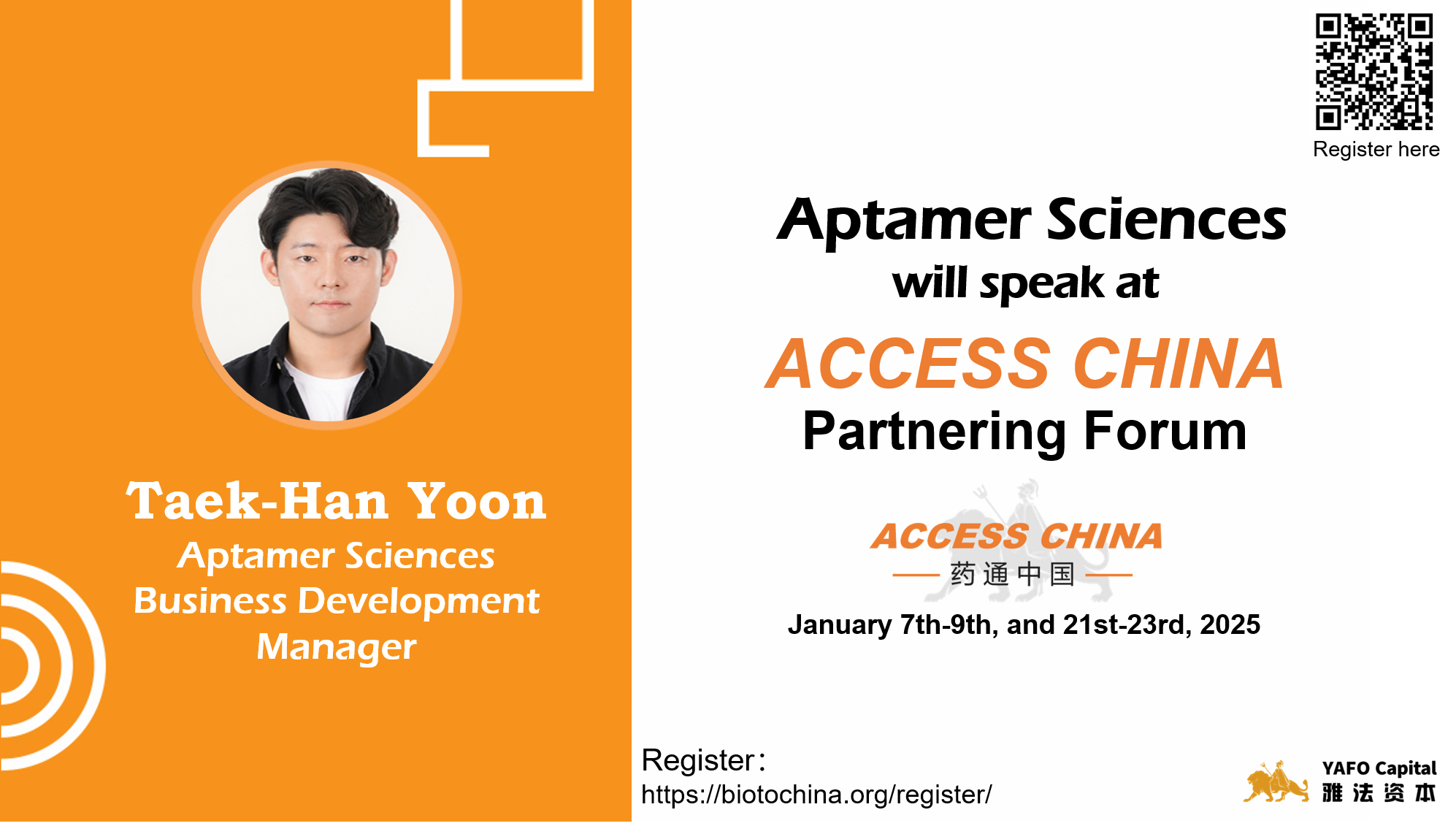 December 13th, 2024 (Shanghai) — We are glad to announce that Taek-Han Yoon, Business Development Manager of Aptamer Sciences, will be presenting at the ACCESS CHINA Partnering Forum @ JPM on January 7th-9th, and 21st-23rd, 2025. ACCESS CHINA Biotech Forum is the largest corporate access event between Asia and the Western biopharma industry.