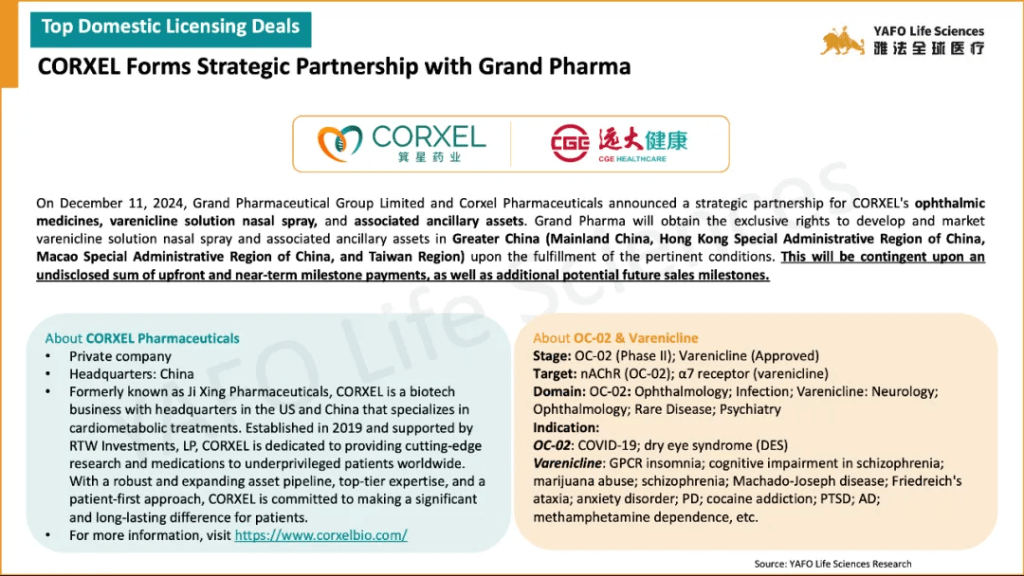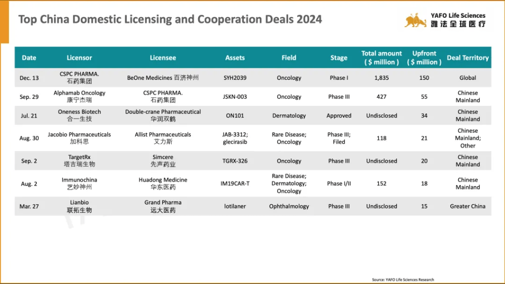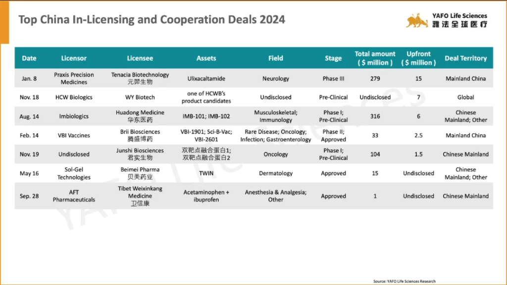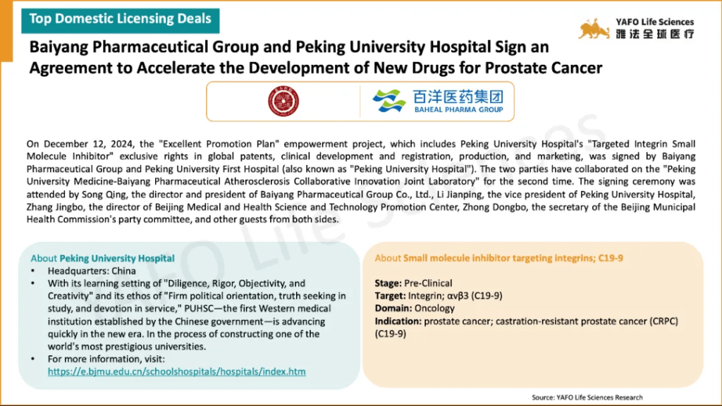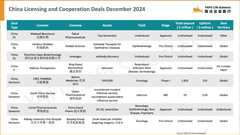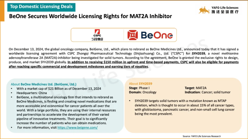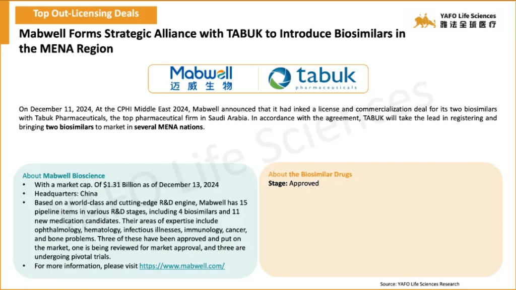 The standout out-licensing transaction was Mabwell’s strategic collaboration with TABUK for two biosimilars targeting the Middle East and North Africa regions. The sole in-licensing transaction of the week involved King-Friend acquiring global rights (excluding Greater China) for XENLETA® from Nabriva Therapeutics. Among domestic deals, the most notable was CSPC Pharmaceutical Group licensing global rights for its MAT2A inhibitor SYH2039 to BeOne. This agreement included an upfront payment of $150 million and a total deal value of $1.835 billion.