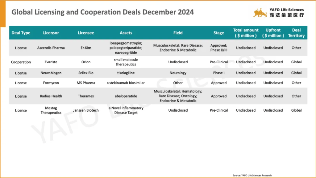 From December 7 to 13, 2024, the global pharmaceutical market saw the signing of 21 asset licensing and collaboration agreements. The China Biotech Industry accounted for eight of these deals, including 3 out-licensing transactions, 1 in-licensing transaction, and 4 domestic agreements.