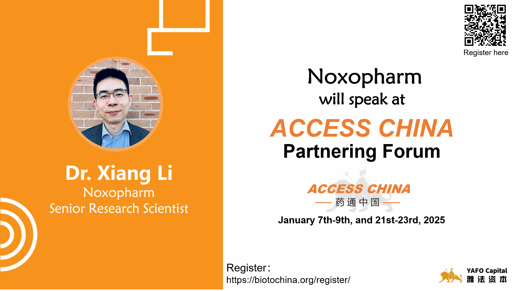 December 20th, 2024 (Shanghai) — We are glad to announce that Dr. Xiang Li, Senior Research Scientist of Noxopharm, will be presenting at the ACCESS CHINA Partnering Forum @ JPM on January 7th-9th, and 21st-23rd, 2025. ACCESS CHINA Biotech Forum is the largest corporate access event between Asia and the Western biopharma industry.