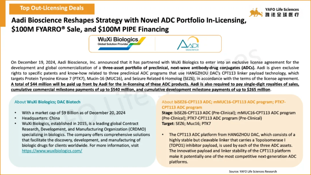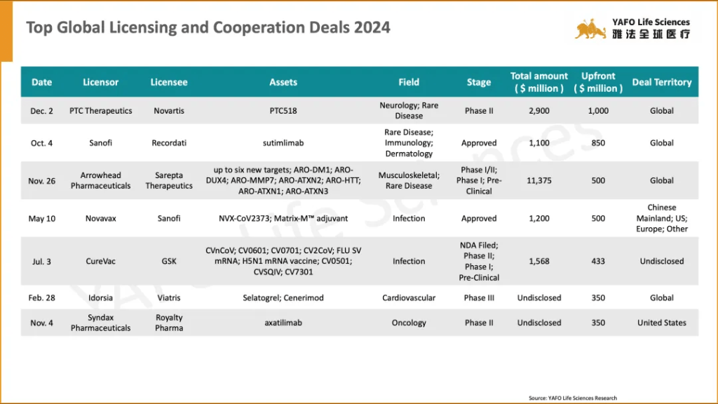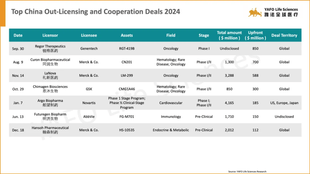 The most significant out-licensing agreement involved Hansoh Pharmaceutical and Merck & Co., centered on the preclinical asset HS-10535. This deal had a total value of $2.012 billion, including an upfront payment of $112 million. Another notable in-licensing agreement saw Eli Lilly and Innovent Biologics collaborate on the approved asset pirtobrutinib.