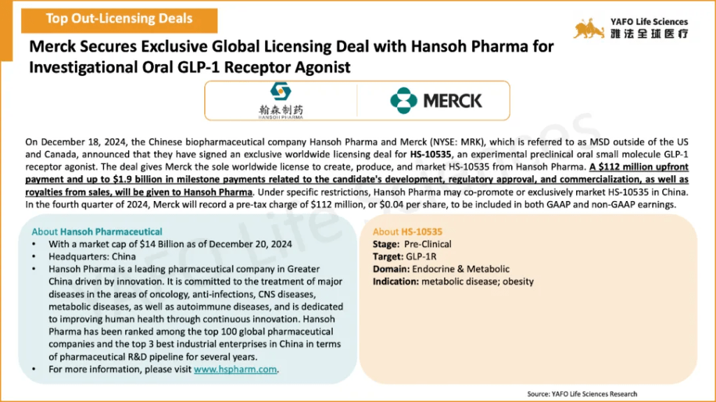 本周中国市场最值得关注的出海交易是翰森制药与Merck就临床前口服GLP-1受体激动剂HS-10535达成的授权交易,首付款1.12亿美元,总价值20.12亿美元。引进交易方面,Eli Lilly与信达生物就已上市药物pirtobrutinib达成中国大陆地区的商业化协议。