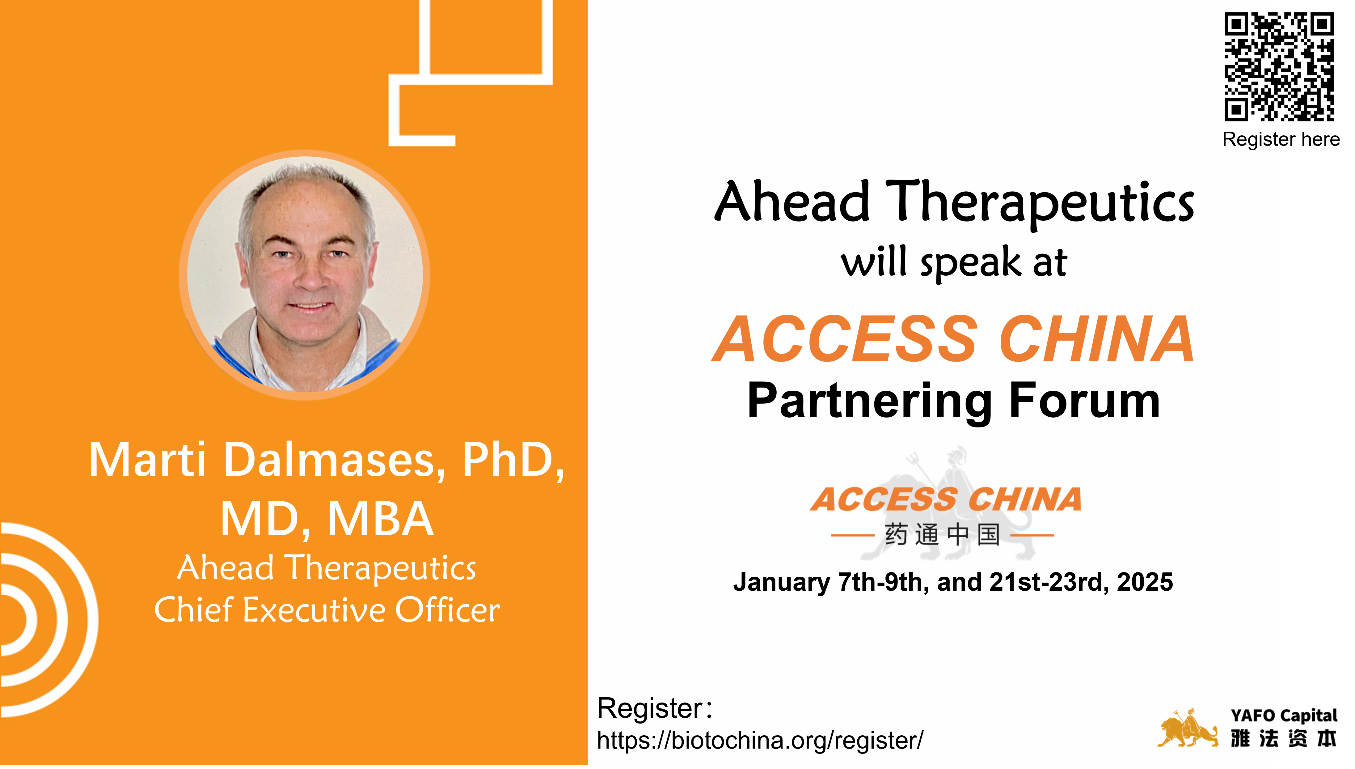 January 2nd, 2025 (Shanghai) — We are glad to announce that Marti Dalmases, the Chief Executive Officer of Ahead Therapeutics, will be presenting at the ACCESS CHINA Partnering Forum @ JPM on January 7th-9th, and 21st-23rd, 2025. ACCESS CHINA Biotech Forum is the largest corporate access event between Asia and the Western biopharma industry.