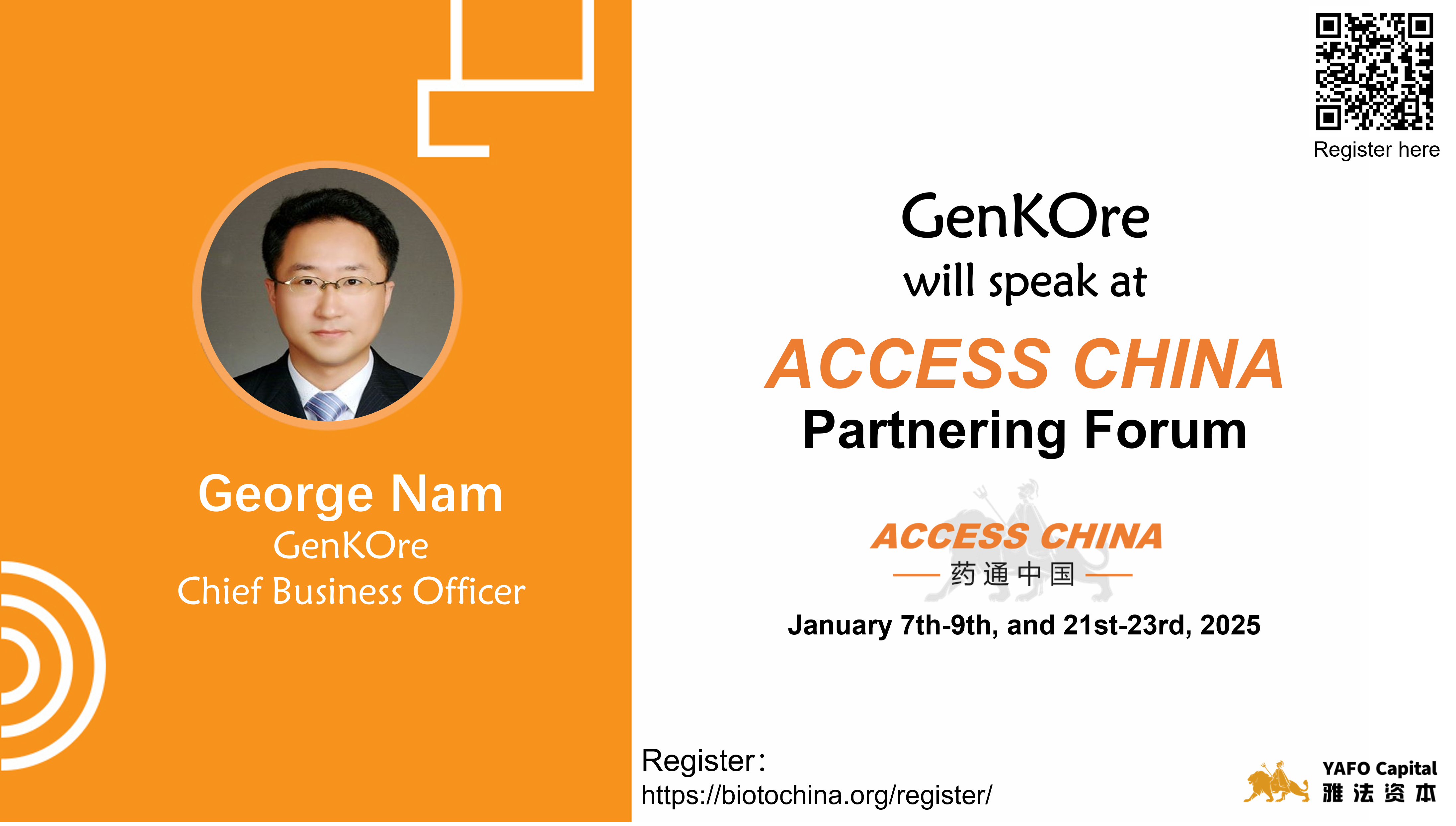 January 3rd, 2025 (Shanghai) — We are glad to announce that George Nam, the Chief Business Officer of GenKOre, will be presenting at the ACCESS CHINA Partnering Forum @ JPM on January 7th-9th, and 21st-23rd, 2025. ACCESS CHINA Biotech Forum is the largest corporate access event between Asia and the Western biopharma industry.