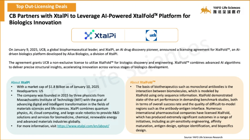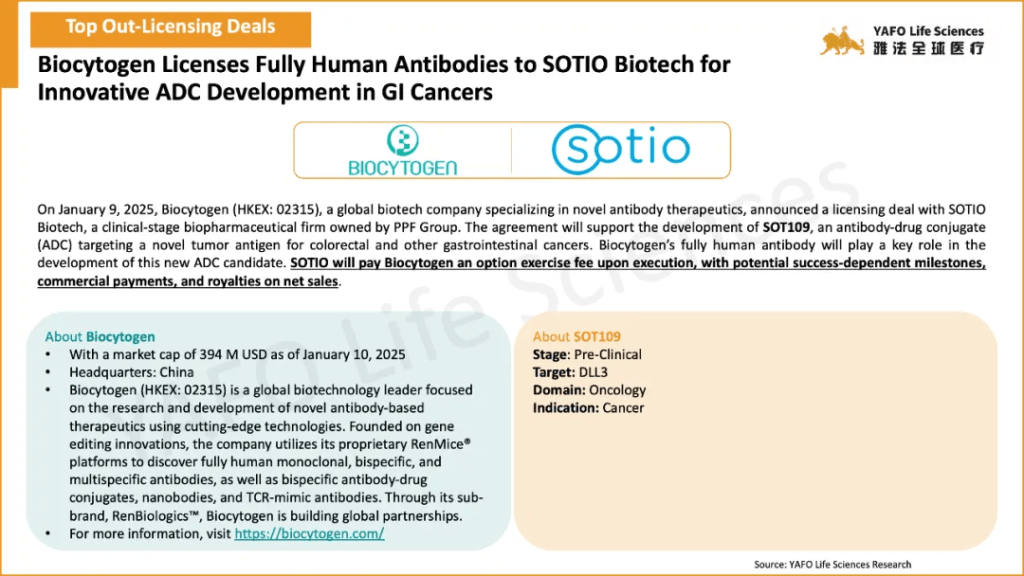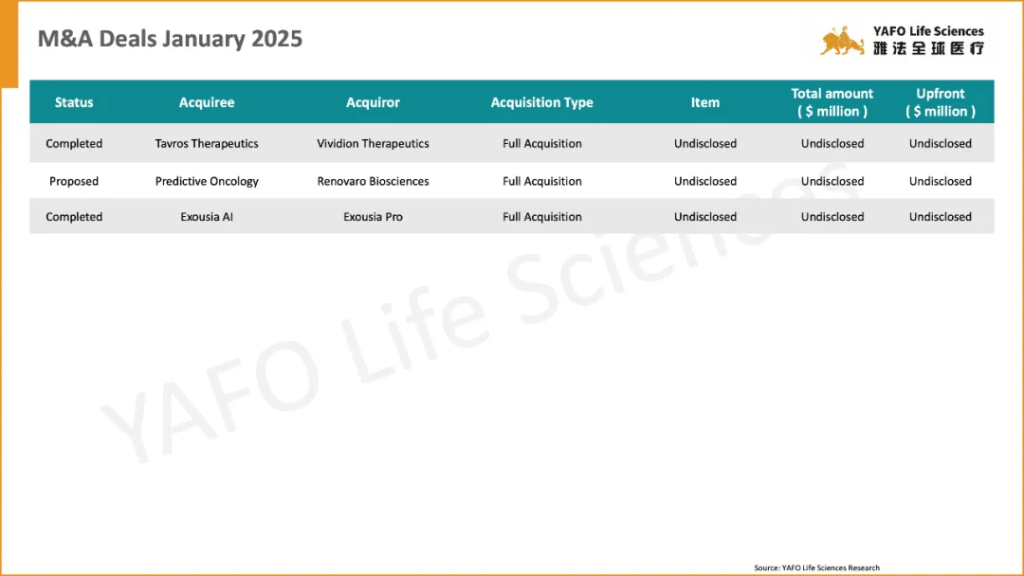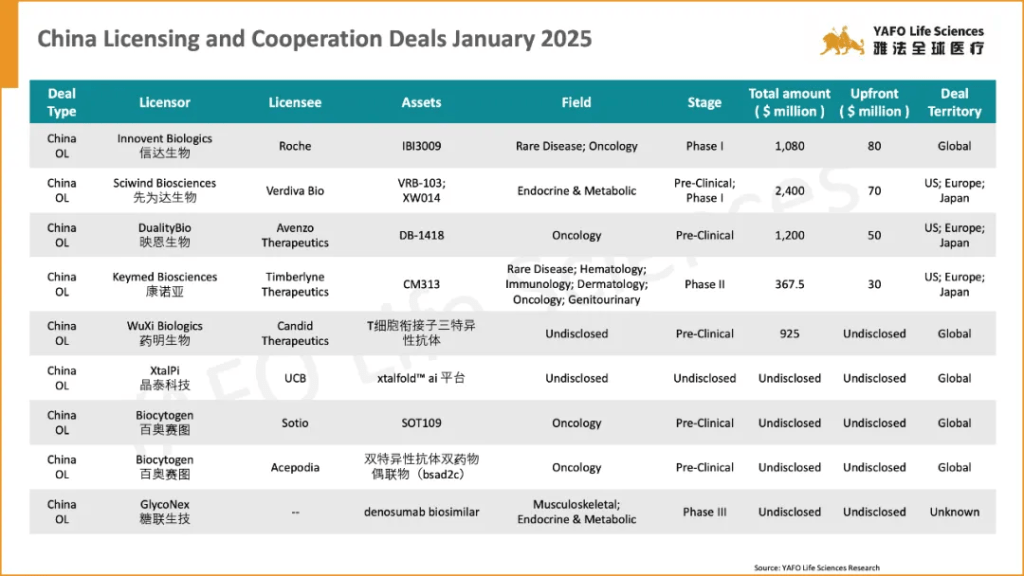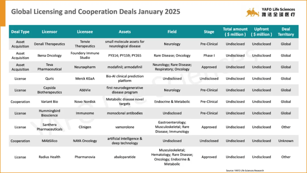 In the first week of January 2025, a total of 37 licensing and cooperation deals were signed worldwide. Within China’s biotech industry, there were 9 out-licensing deals, 3 in-licensing deals, and 4 domestic deals.