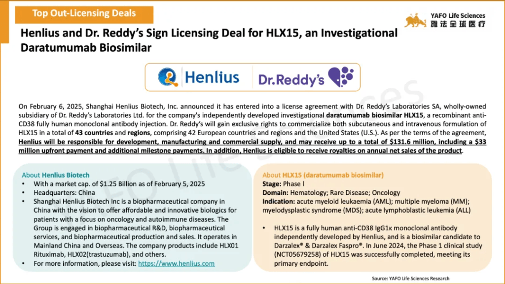 In the first week of February, a total of 6 deals were signed globally. Within the China Biotech industry, there was only one out-licensing deal—between Henlius Biotech and Dr. Reddy’s Laboratories—for the Phase I asset, daratumumab biosimilar. The agreement has a total deal value of $131.6 million, including an upfront payment of $33 million.