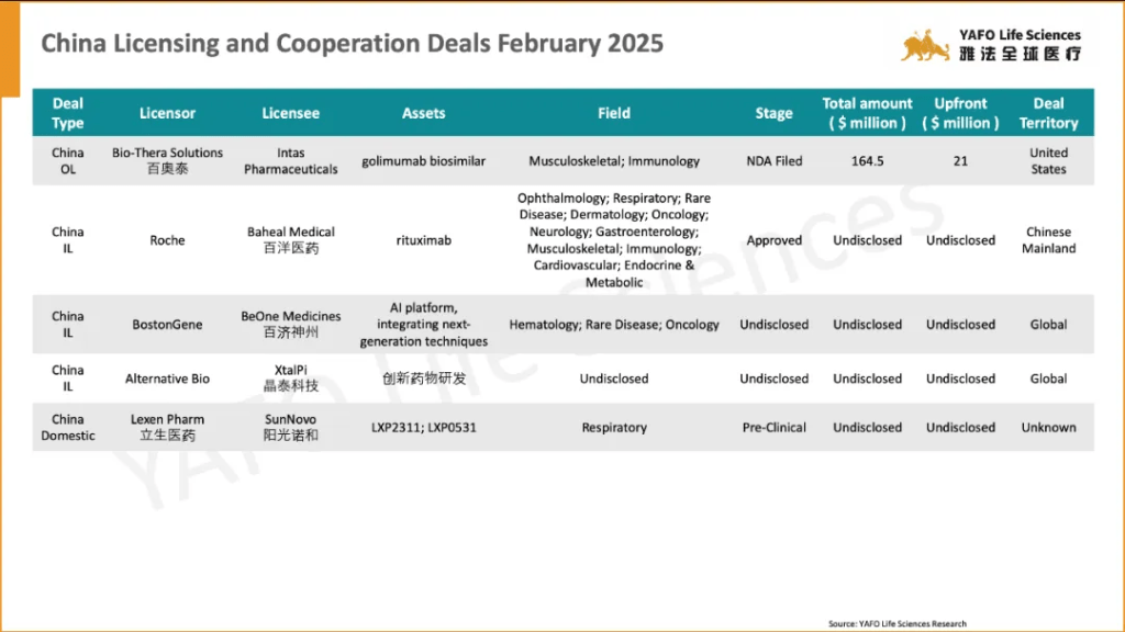 Bio-Thera Solutions and Intas Pharmaceuticals signed an out-licensing deal for golimumab biosimilar with a total deal amount of $164.5 million and an upfront payment of $21 million. Roche and Baheal Medical signed a cooperation deal for the approved drug, rituximab. Lexen Pharm and SunNovo signed cooperation deal for the pre-clinical stage assets, LXP2311 and LXP0531.