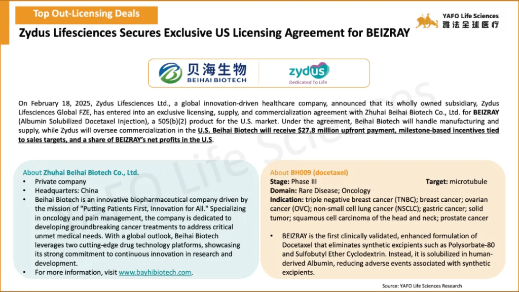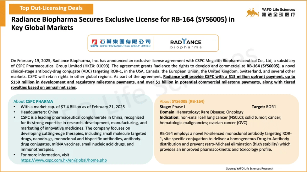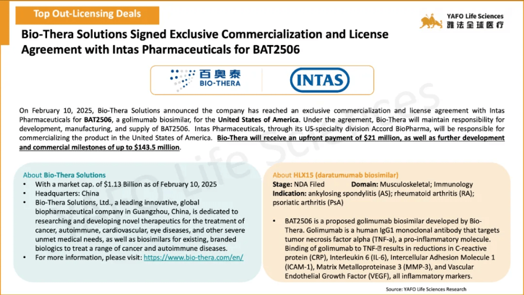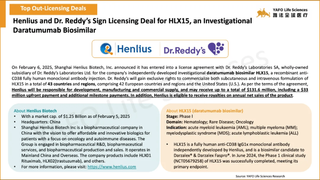 The most notable out-licensing agreement of the month was between Henlius Biotech and Dr. Reddy’s Laboratories for HLX15 (a daratumumab biosimilar) in Phase I. The deal totaled $132 million, with an upfront payment of $33 million.