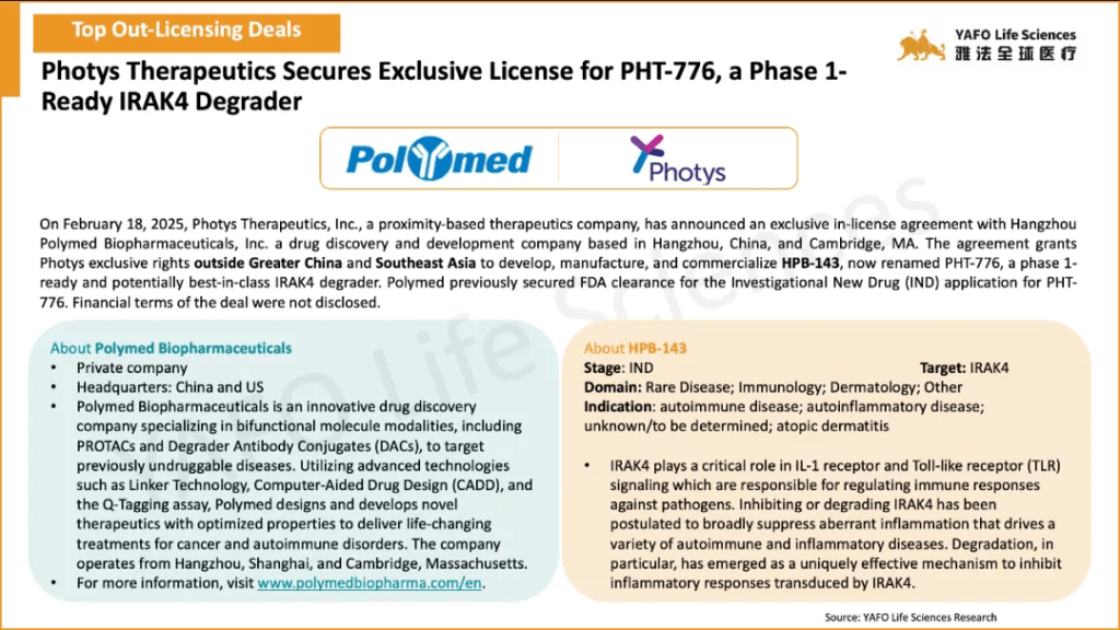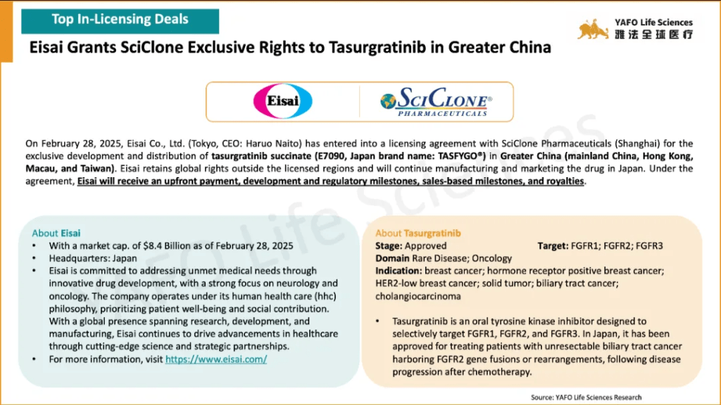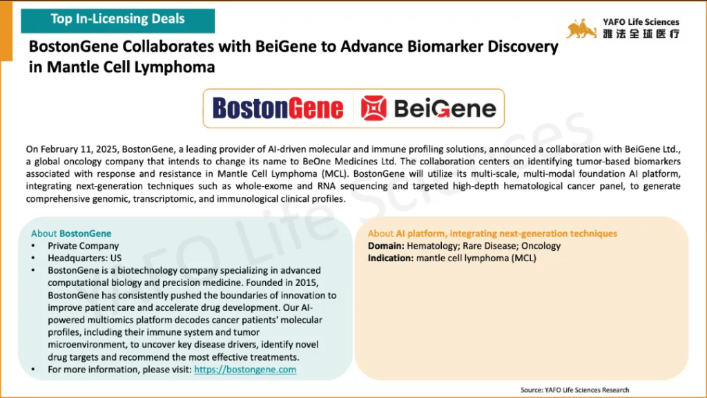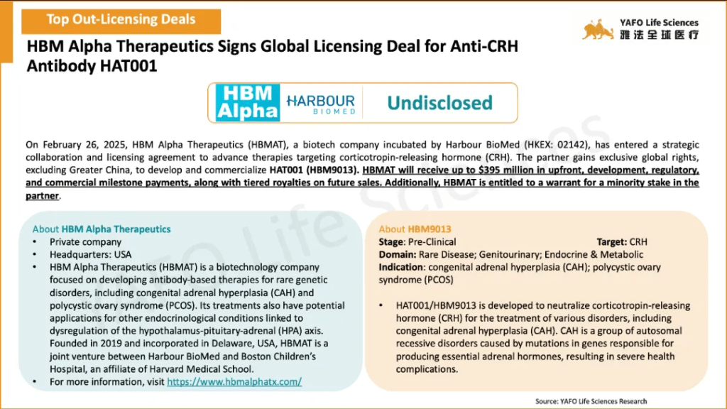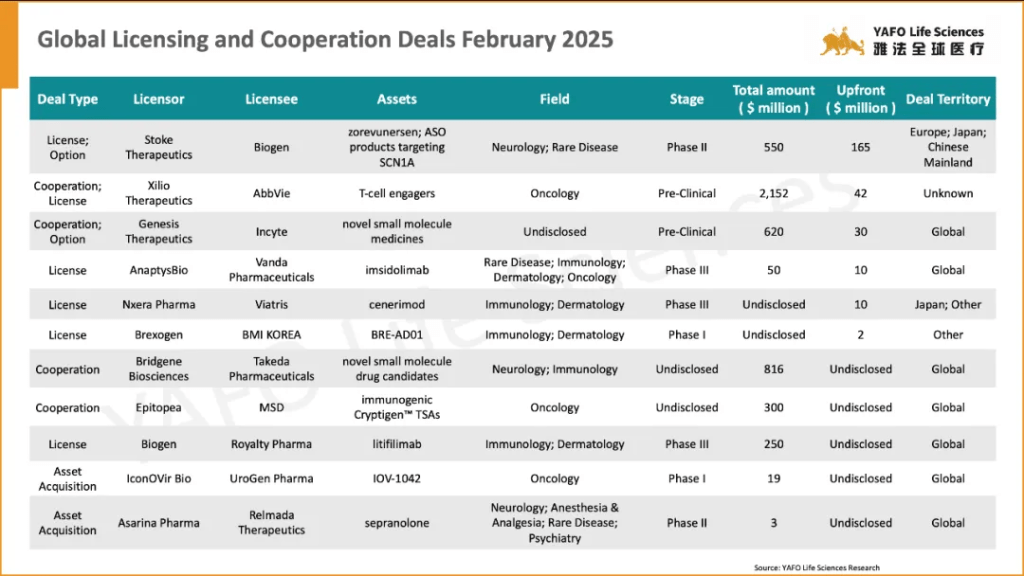 Globally, 38 deals were signed. The most significant was a licensing and option agreement between Stoke Therapeutics and Biogen for zorevunersen and ASO products targeting SCN1A. The deal was valued at $550 million, with an upfront payment of $165 million.