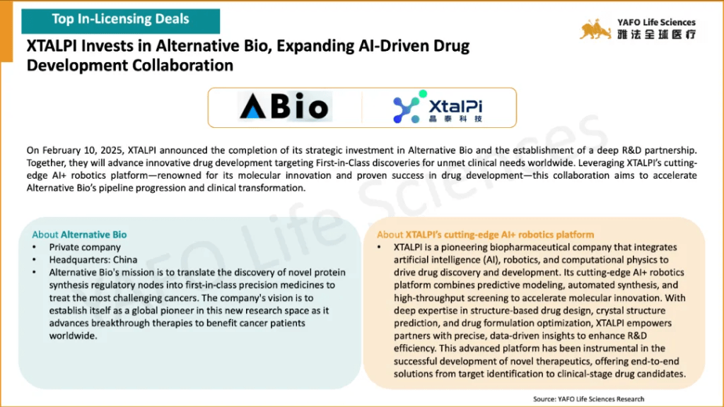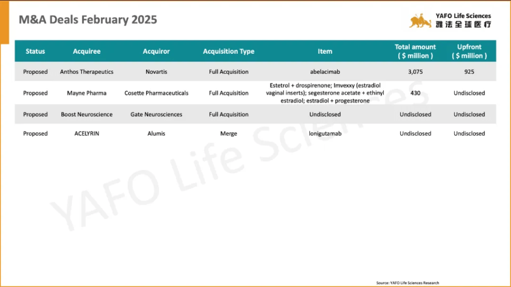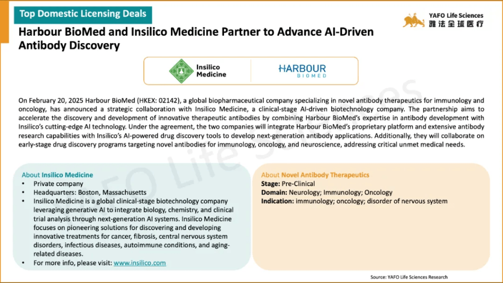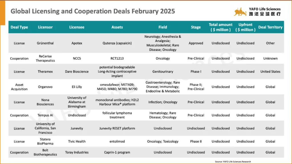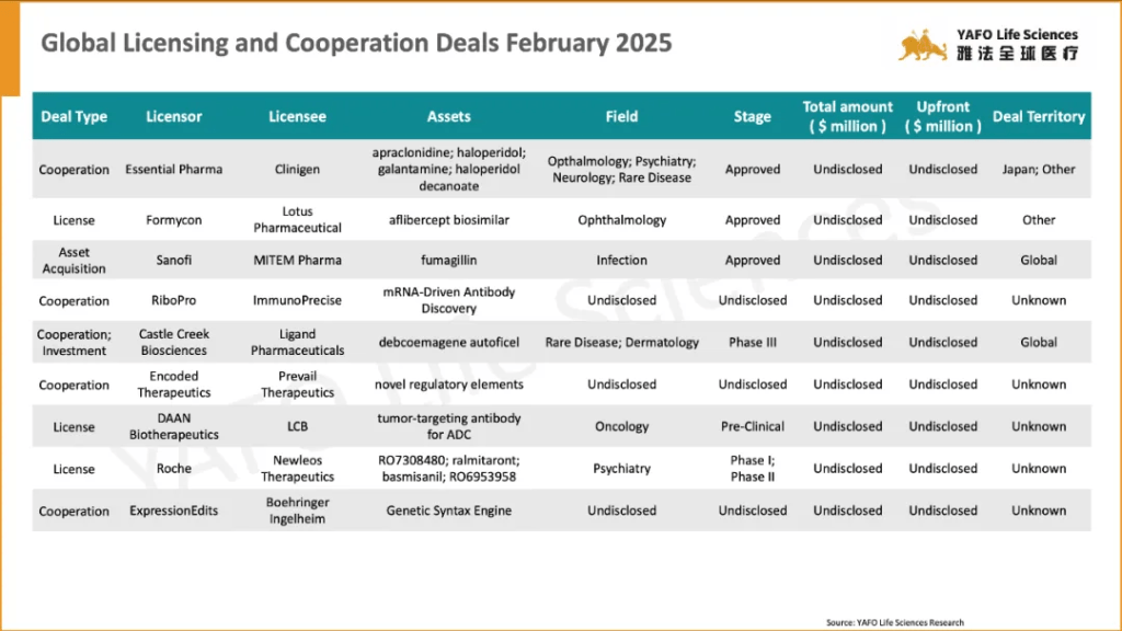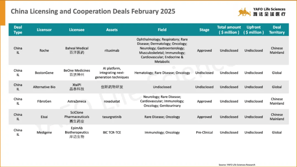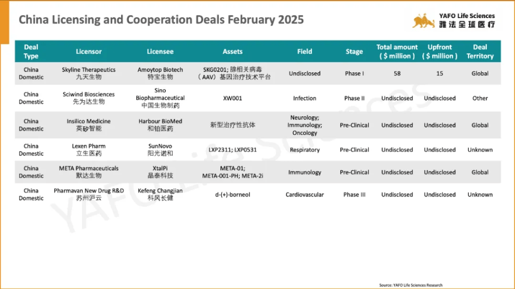 In February, 56 deals were signed globally. Within China’s biotech industry, there were 6 in-licensing deals, 6 out-licensing deals, and 6 domestic deals.
