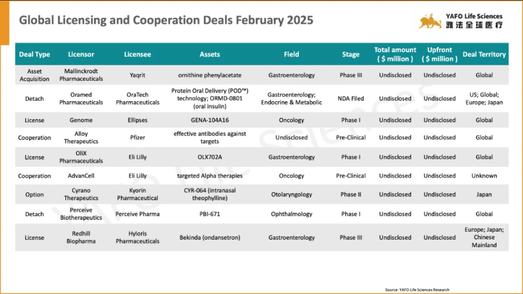2025年2月,全球医药市场共签署了56项资产授权和合作协议。中国市场共达成18项,包括6项出海交易、6项引进交易和6项国内交易。