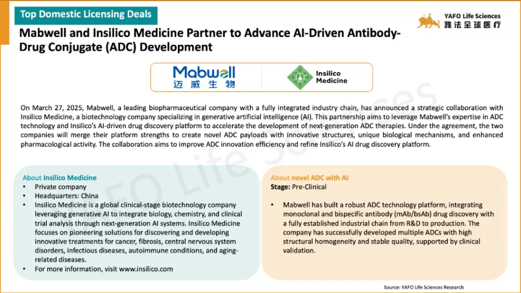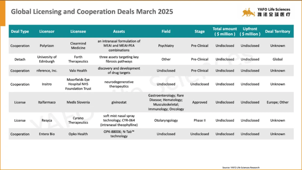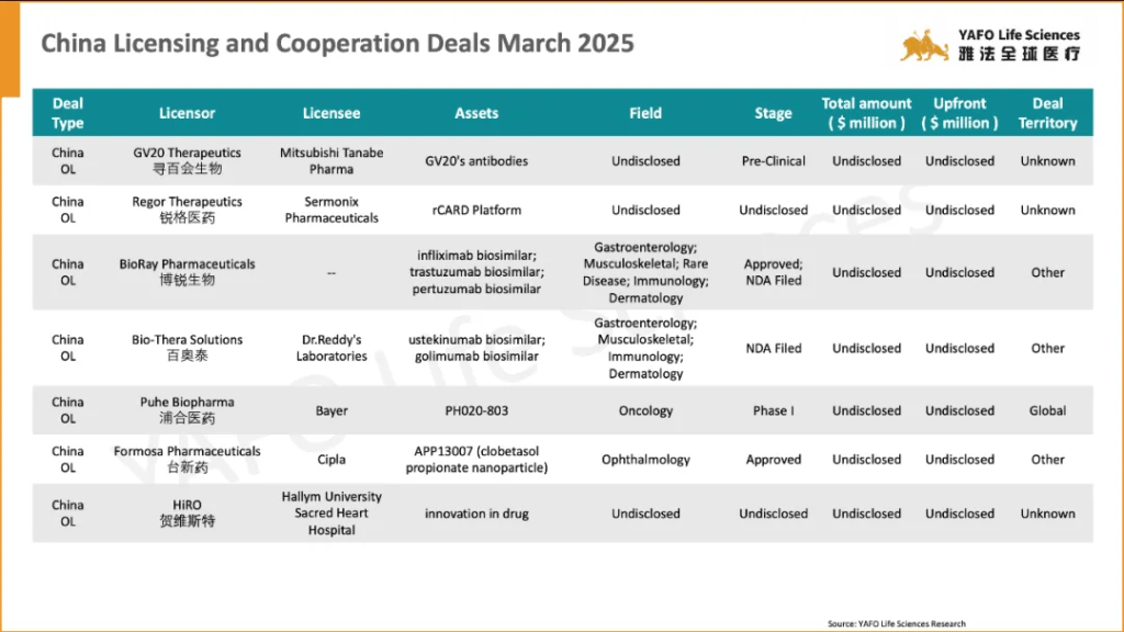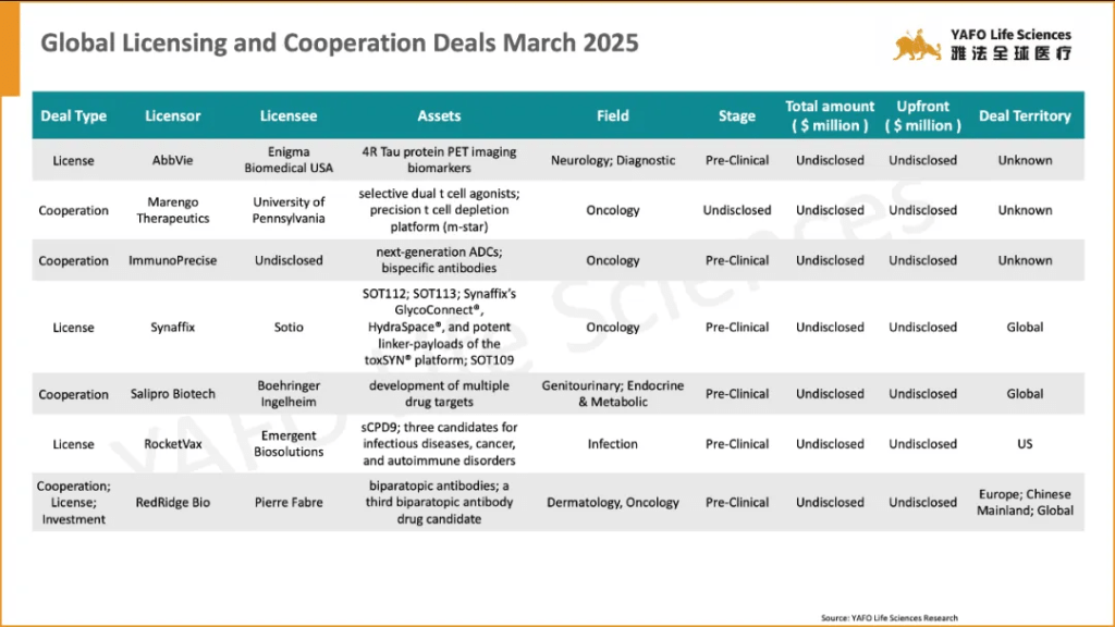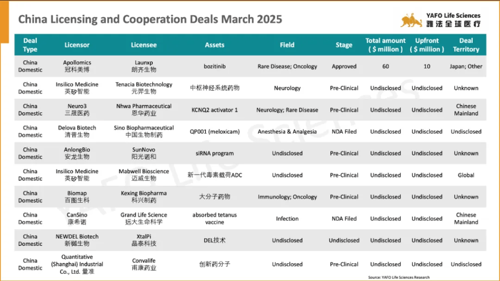 In March, 80 deals were signed globally.Within China’s biotech industry, there were 11 out-licensing deals, 3 in-licensing deals, and 10 domestic licensing deals.