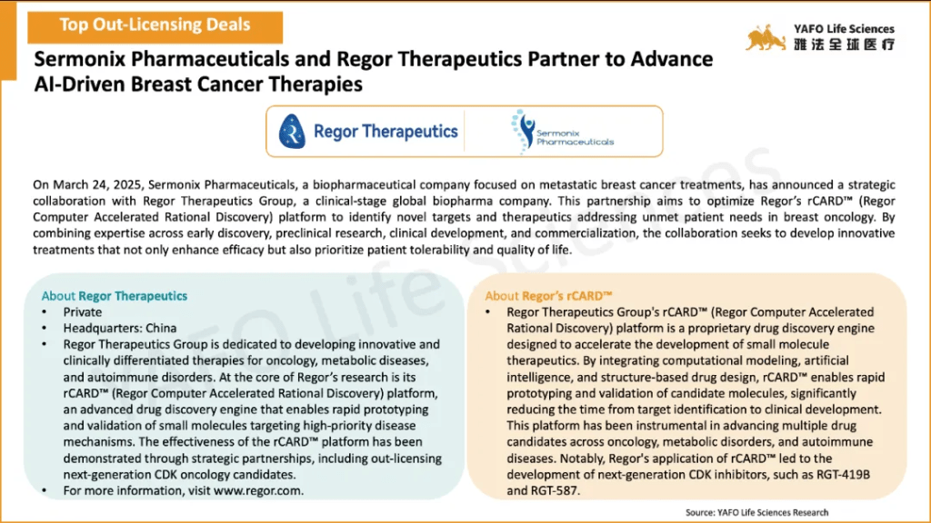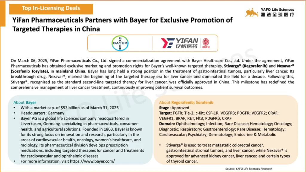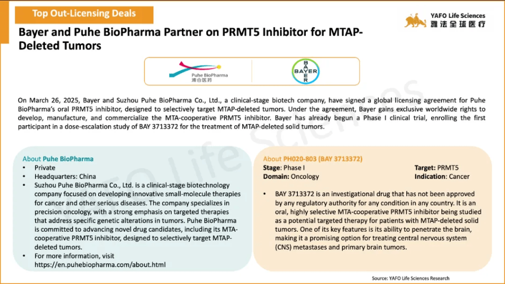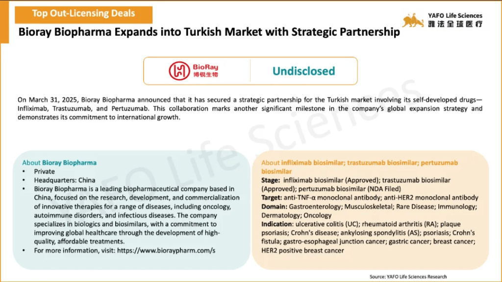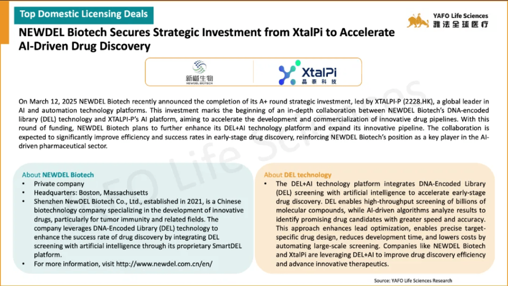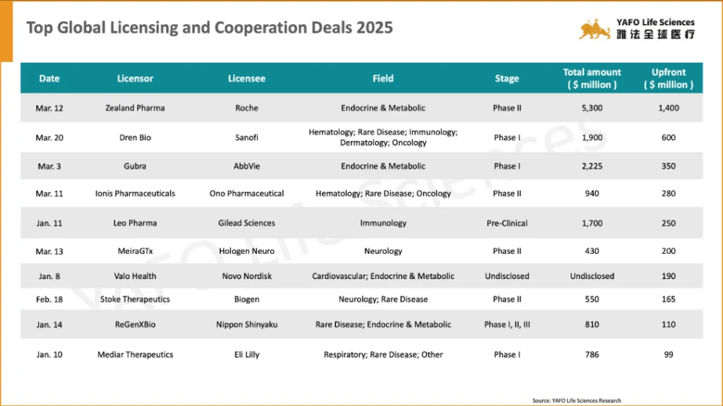In March, 80 deals were signed globally.Within China’s biotech industry, there were 11 out-licensing deals, 3 in-licensing deals, and 10 domestic licensing deals.