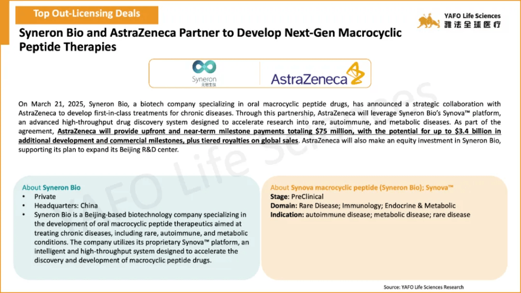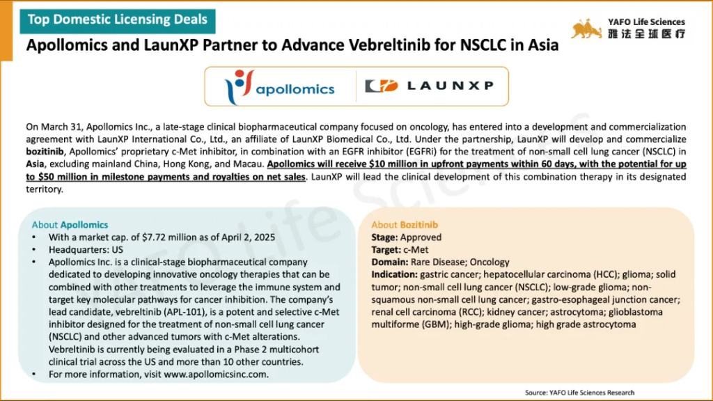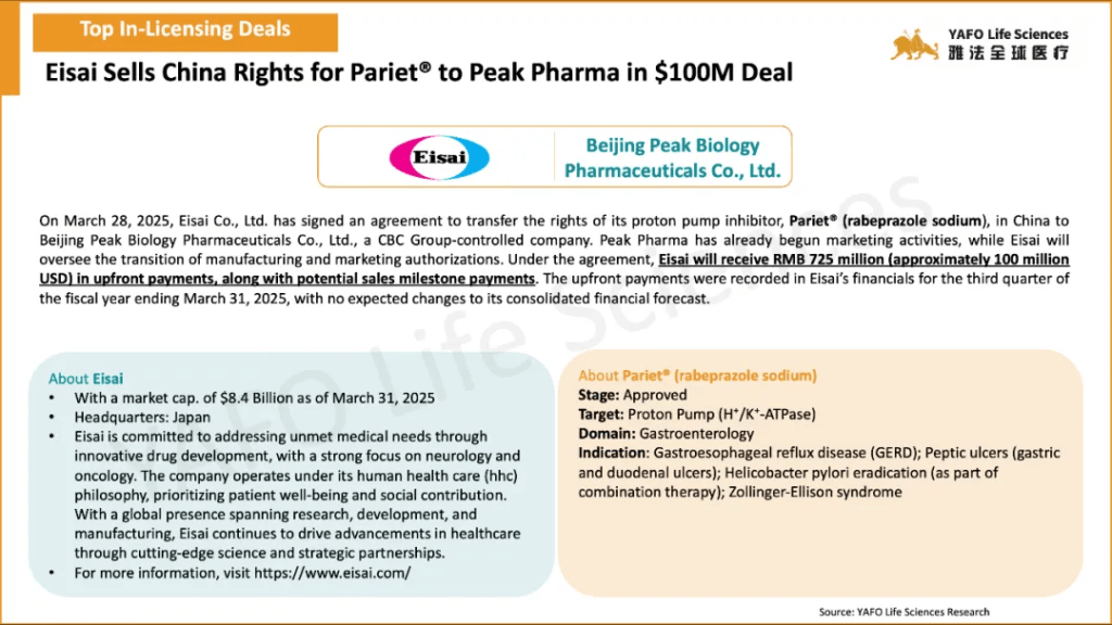The top out-licensing deal of the month was between United Laboratories and Novo Nordisk for the Phase I GLP-1 asset, UBT251. The agreement included an upfront payment of $200 million and a total deal value of $2 billion. The top in-licensing deal in March was between Eisai and Beijing Peak Biology Pharmaceuticals Co., Ltd. for the approved asset Rabeprazole (Pariet®), with an upfront payment of $100 million. The leading domestic deal was between Apollomics and Launxp for the approved asset Bozitinib, with a total deal value of $60 million and an upfront payment of $ 10 million.