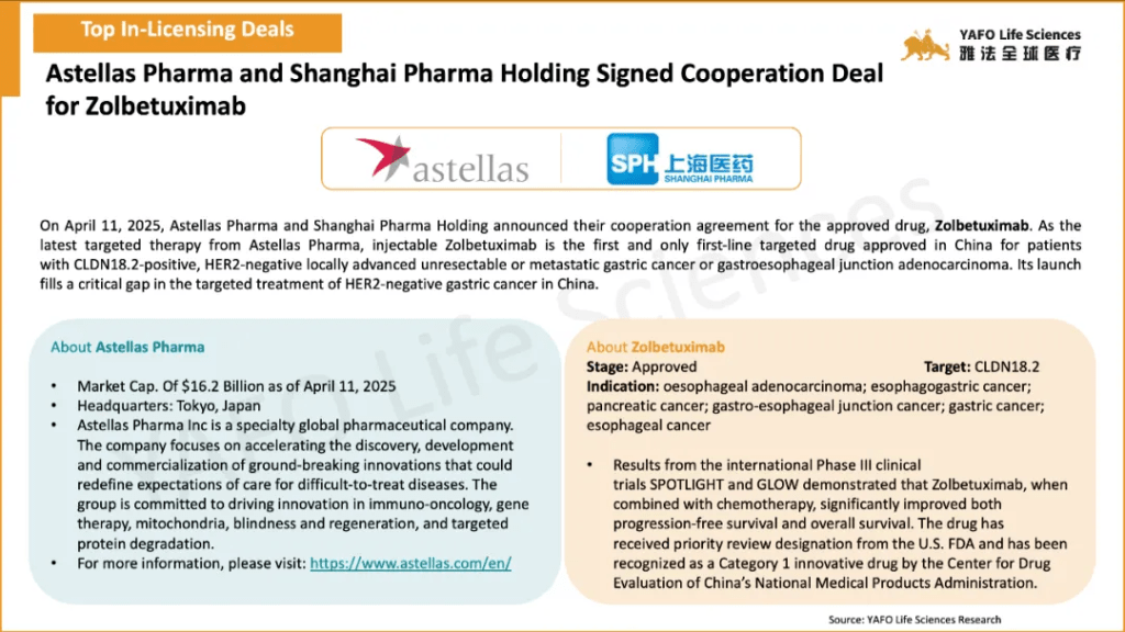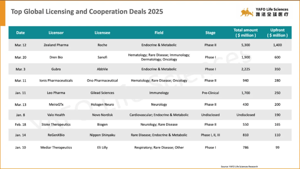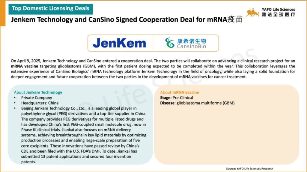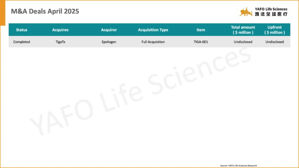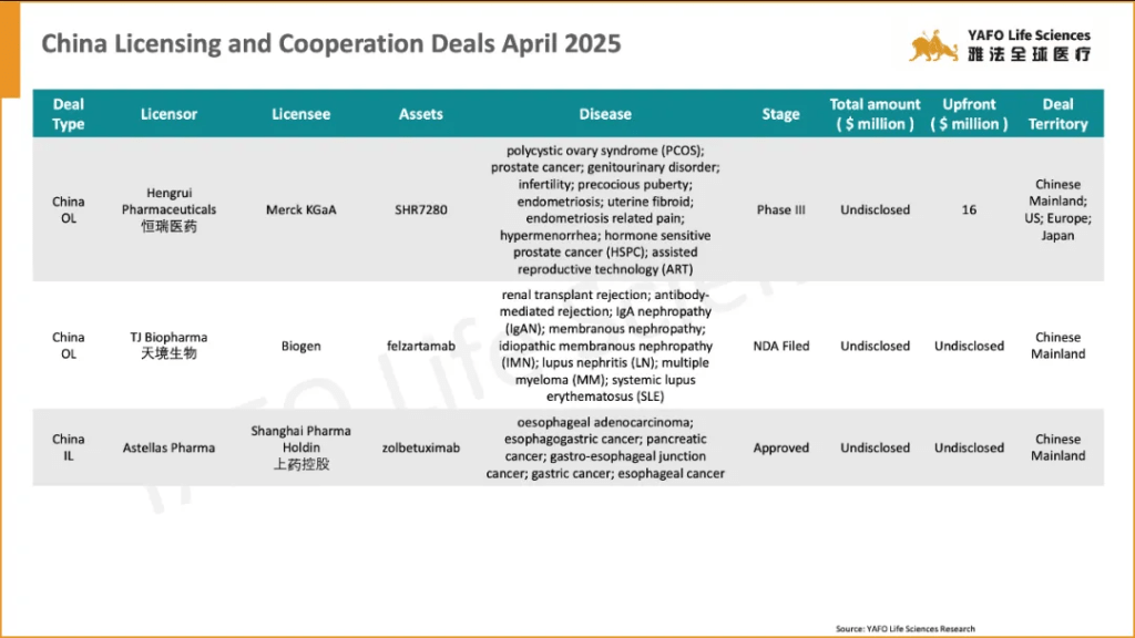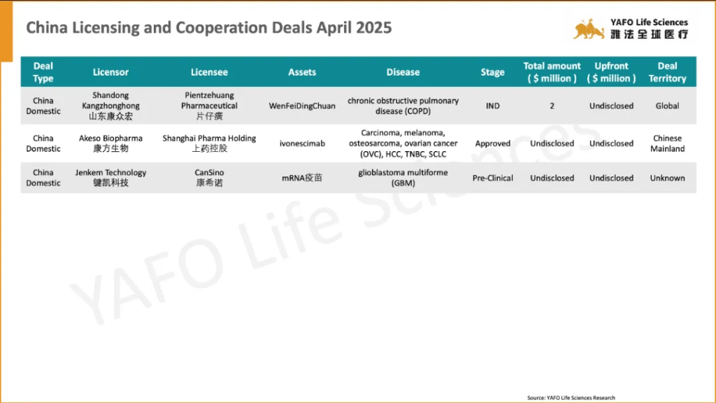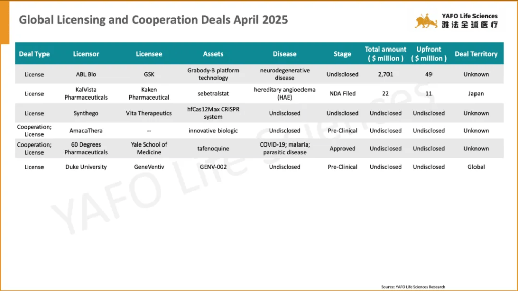 From April 7 to 11, a total of 12 biopharma deals were signed globally. Within China’s biotech industry, there were 2 out-licensing deals, 1 in-licensing deal, and 3 domestic deals.