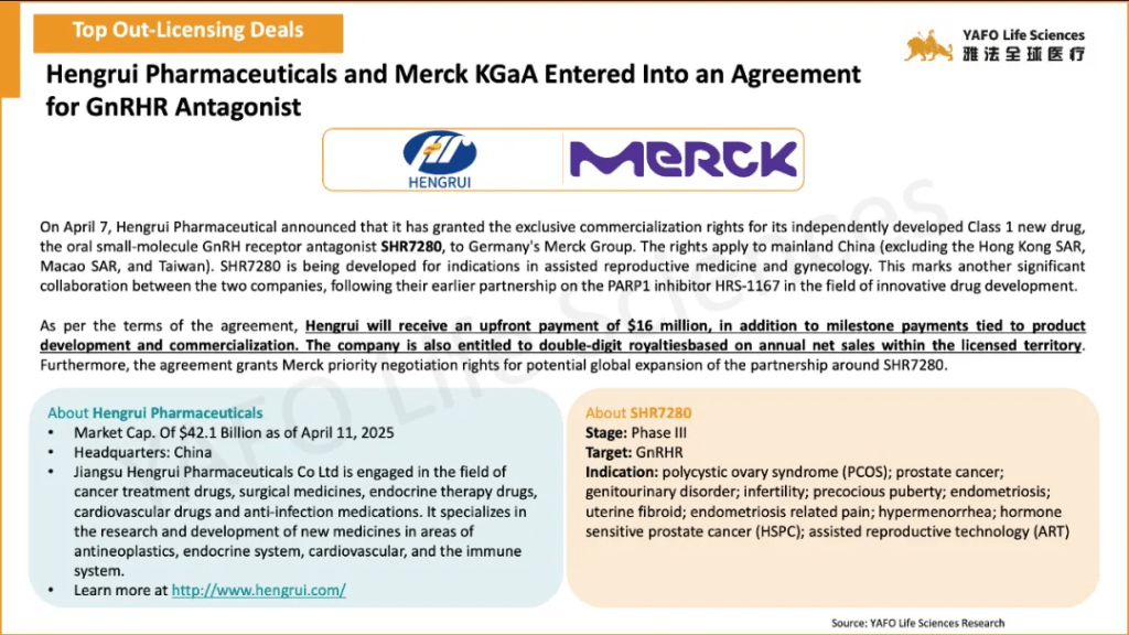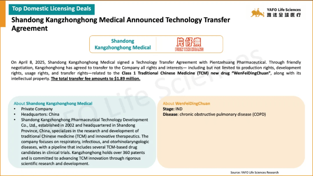 The leading out-licensing deal was between Hengrui Pharmaceuticals and Merck KGaA for SHR7280, with an upfront payment of $16 million. The top domestic deal was between Shandong Kangzhonghong Medical and Pientzehuang Pharmaceutical for WenFeiDingChuan, valued at $2 million.