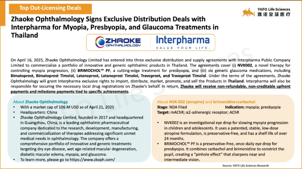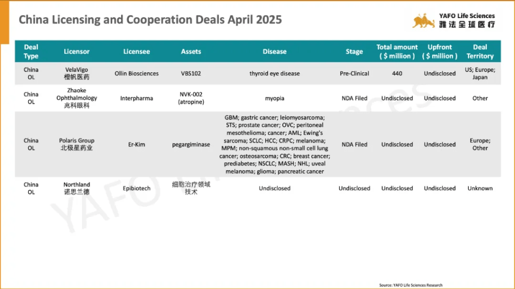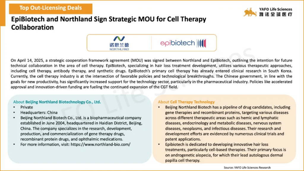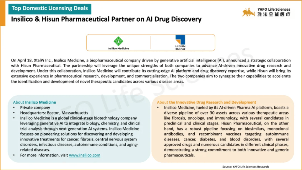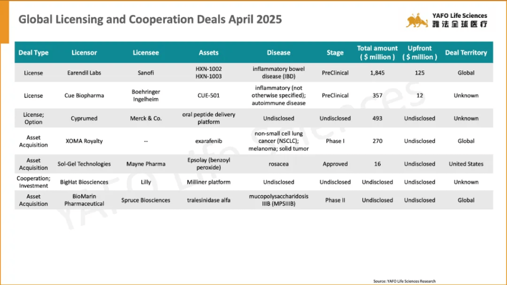 Between April 14 and 18, a total of 20 agreements were finalized. Within China’s biotech industry, this included four out-licensing deals and three domestic partnerships.