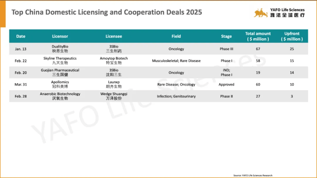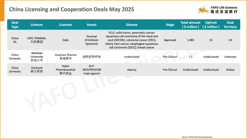 CSPC Pharma and Cipla signed an out-licensing deal for the approved asset irinotecan liposome, featuring a $15 million upfront payment and a total deal value of $1.065 billion. The leading domestic deal was between Westlake University and InnoCarePharma for an innovative drugs R&D partnership, valued at $7.5 million.