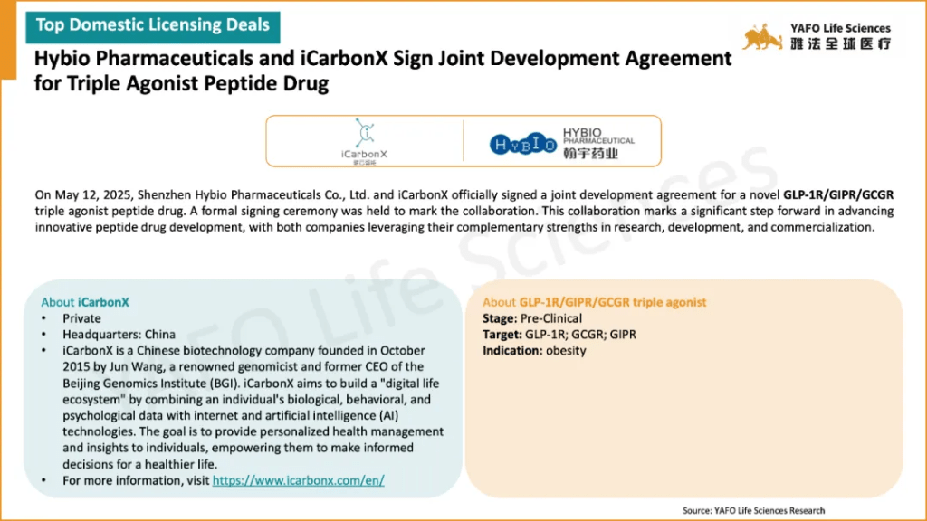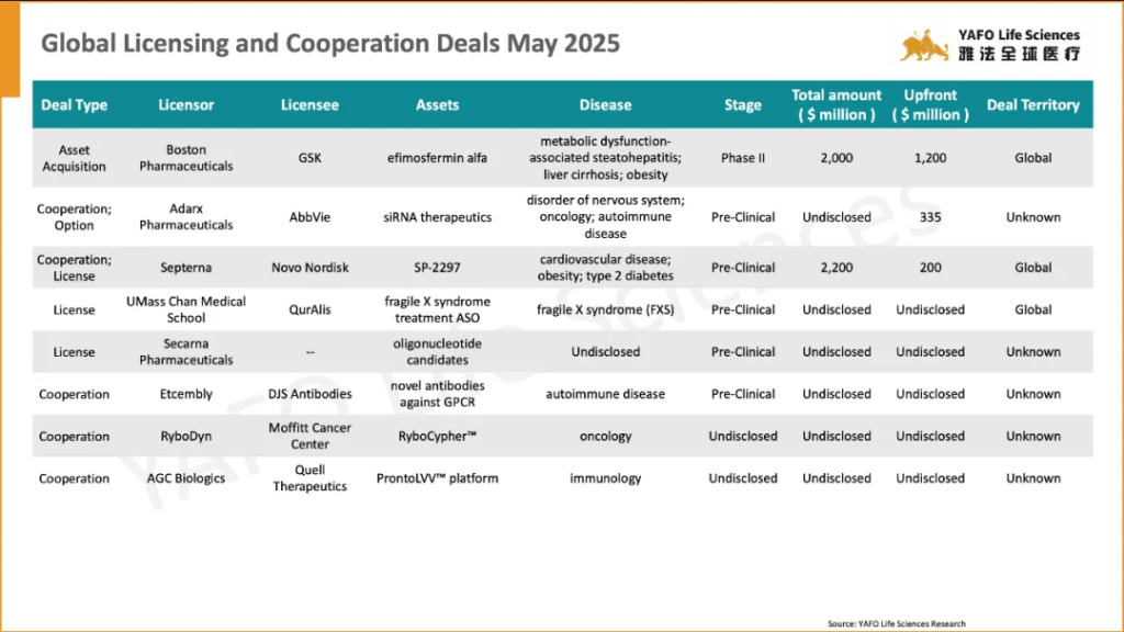 From May 12 to 16, a total of 11 biopharma deals were announced globally. Within China’s biotech sector, one out-licensing agreement and two domestic deals were reported.