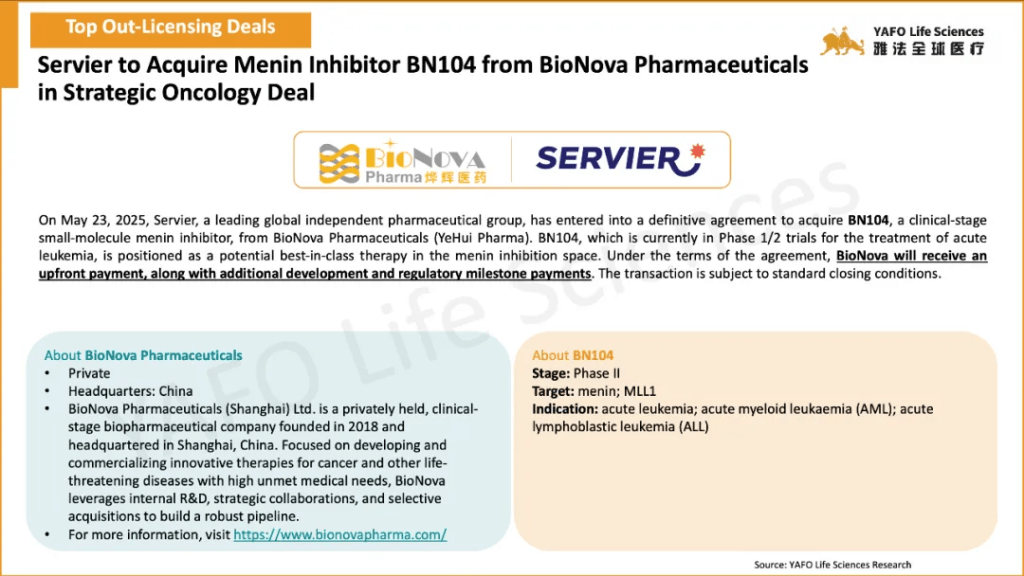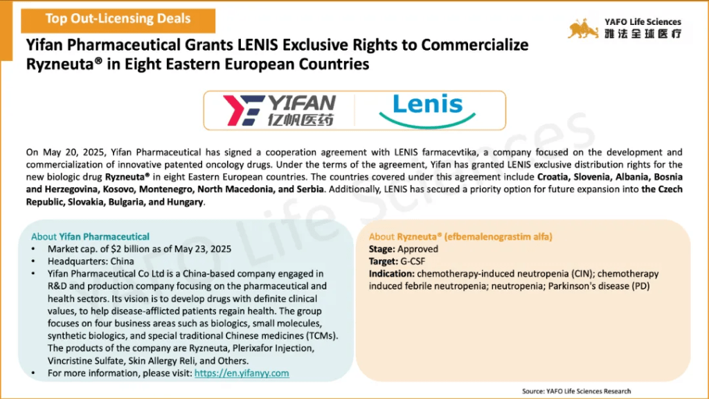 The largest deal of the week was an out-licensing agreement involving 3SBio, GuojianPharmaceutical, and Pfizer, centered on the Phase III oncology asset SSGJ-707. The deal features an upfront payment of $1.25 billion and a total potential value of $6.15 billion.