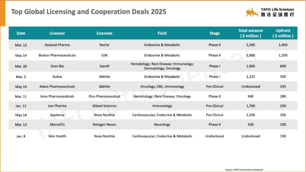 On the global stage, six additional deals were announced. The most prominent was the partnership between Orionis Biosciences and Genentech for pre-clinical small-molecule monovalent glues. The deal includes an upfront payment of $105 million, with a total potential deal value of $2 billion.