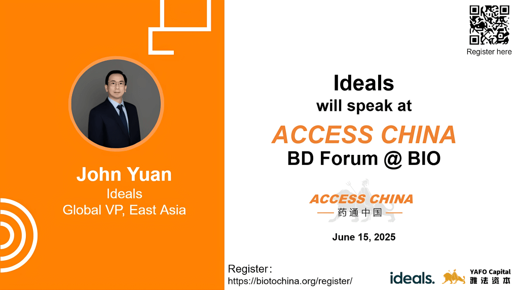 June 15, 2025 (Boston) — We are glad to announce that John Yuan, the Global VP, East Asia of Ideals, will be presenting at the ACCESS CHINA BD Forum @BIO on June 15, 2025. ACCESS CHINA Biotech Forum is the largest corporate access event between Asia and the western biopharma industry.