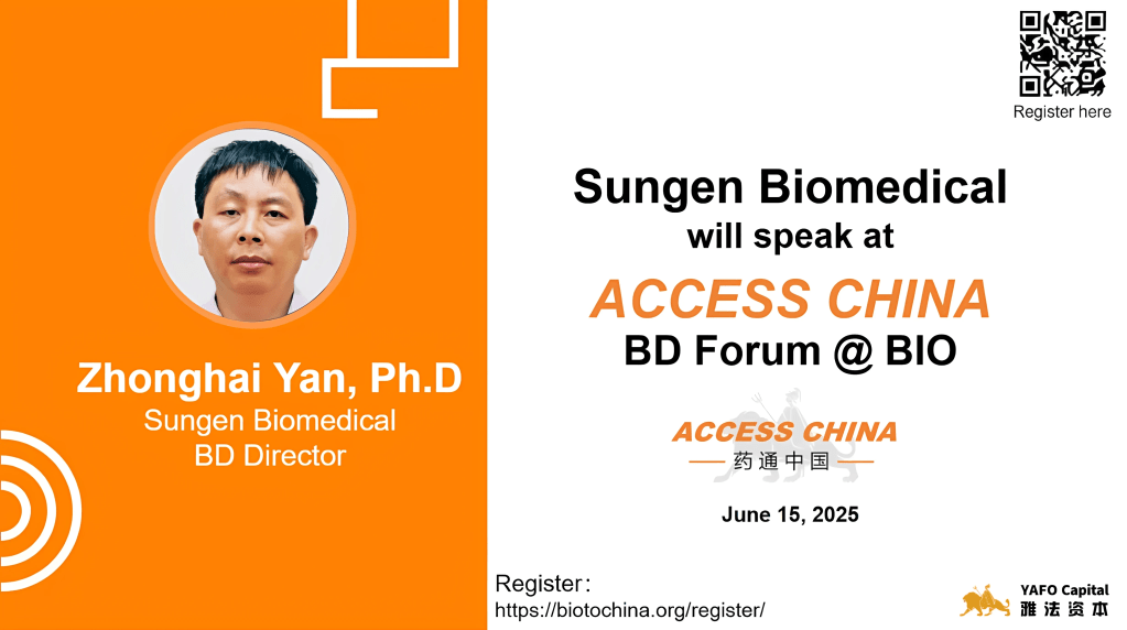 June 15, 2025 (Boston) — We are glad to announce that Zhonghai Yan, Ph.D, the BD Director of Beijing Sungen Biomedical Technology Co., Ltd., will be presenting at the ACCESS CHINA BD Forum @BIO on June 15, 2025. ACCESS CHINA Biotech Forum is the largest corporate access event between Asia and the western biopharma industry.