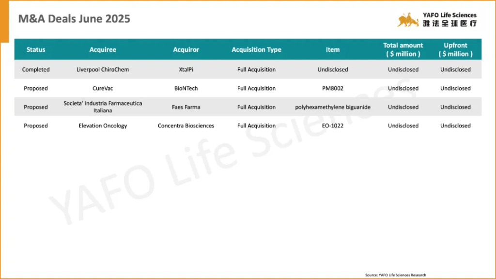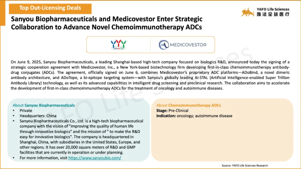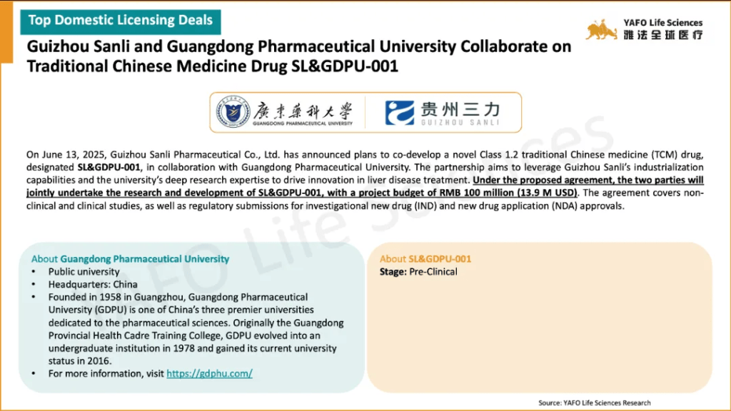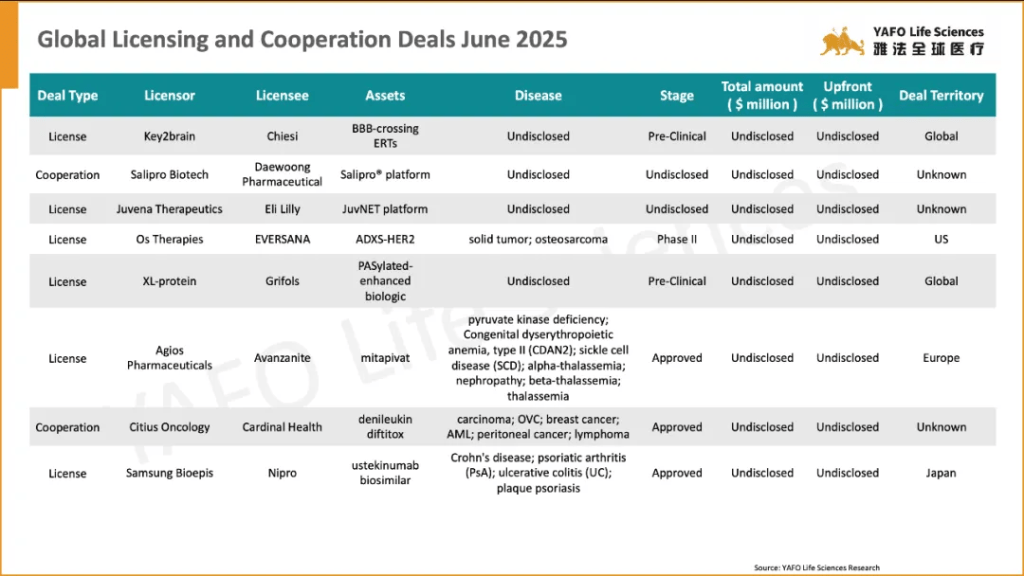 From June 7 to 13, a total of 23 biotech agreements were announced globally. Within the China biotech industry, there were 7 notable deals, comprising 4 out-licensing agreements and 3 domestic transactions.