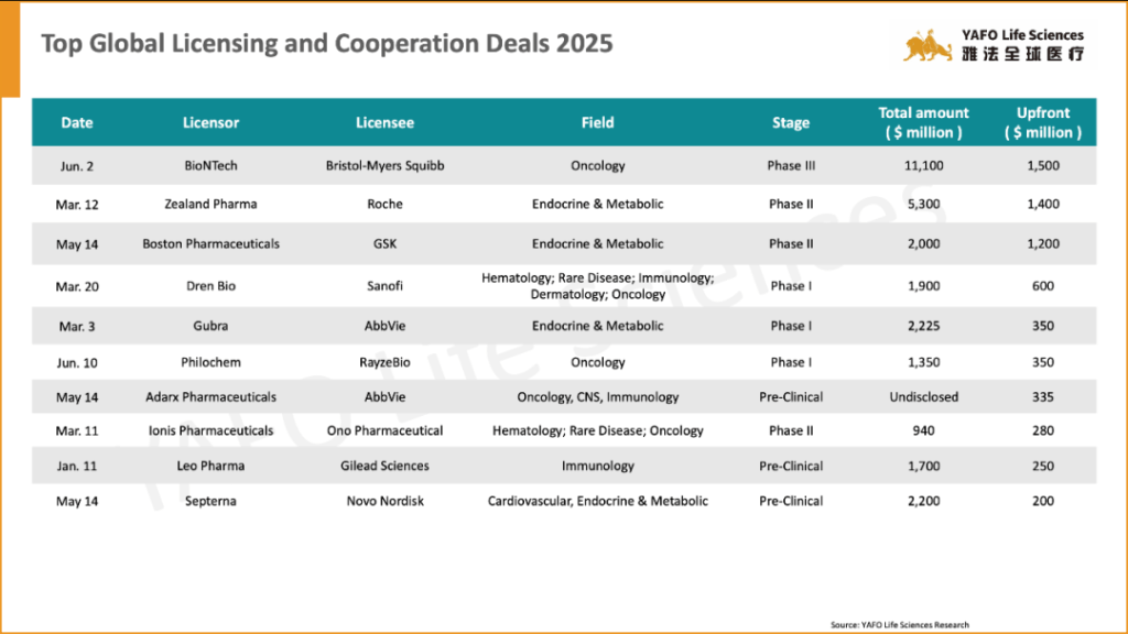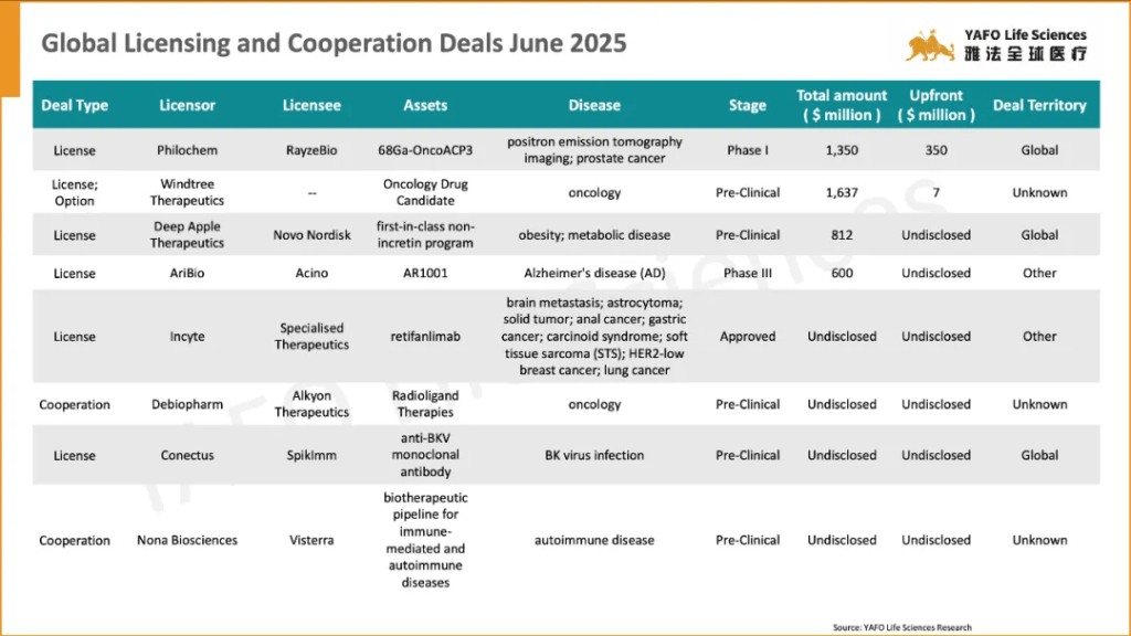 On the global front, 16 agreements were signed during the same period. The most significant deal was between Philochem and RayzeBio for the Phase I asset 68Ga-OncoACP3. This deal includes an upfront payment of $350 million, with a total potential value of $1.35 billion.