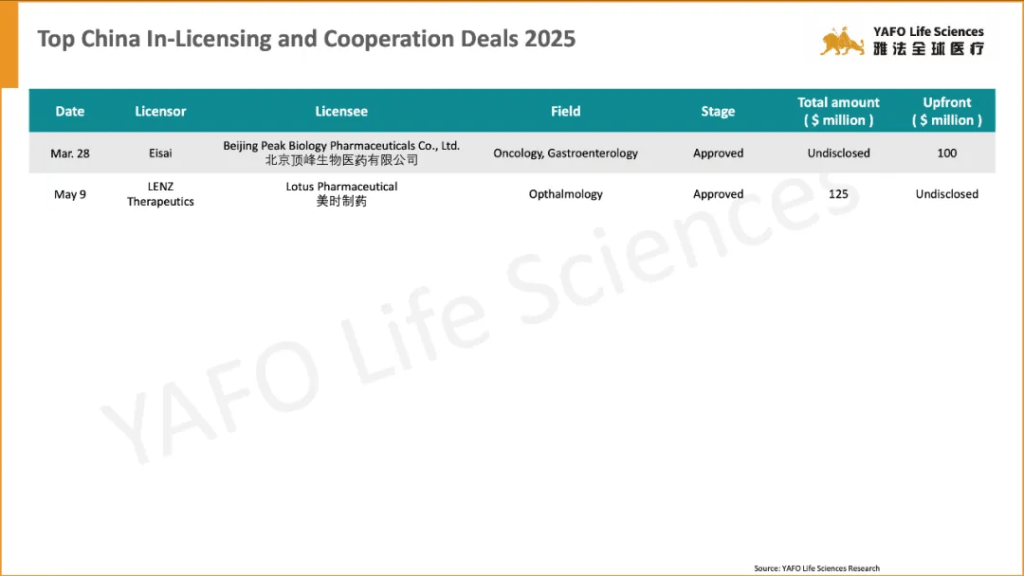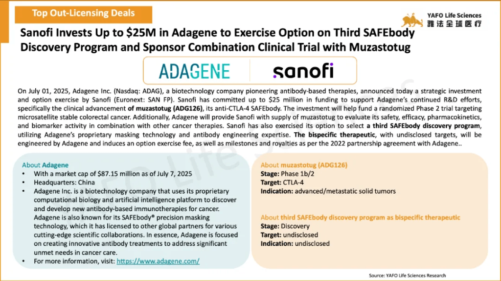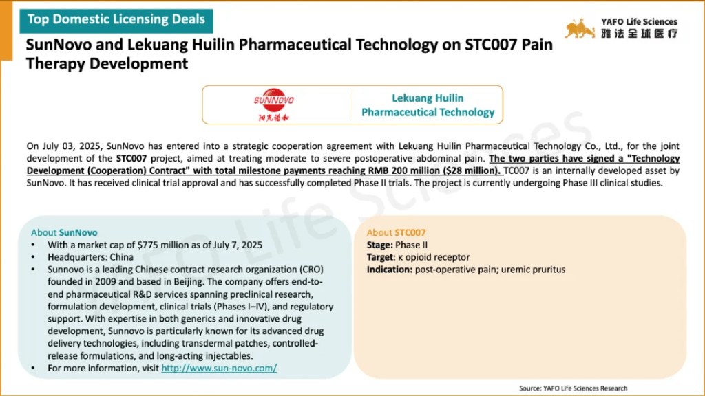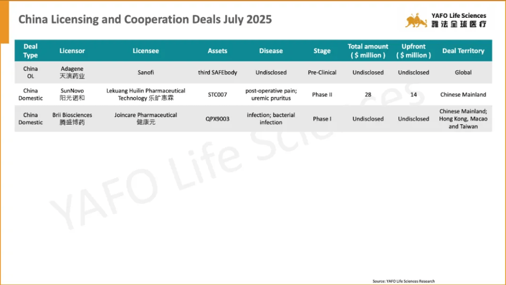 Adagene and Sanofi entered into an out-licensing and investment agreement for Adagene’s third SAFEbody, a pre-clinical asset. Meanwhile, SunNovo signed a domestic licensing deal with Lekuang Huilin Pharmaceutical Technology for the Phase II asset STC007, with a total deal value of $28 million, including an upfront payment of $14 million.