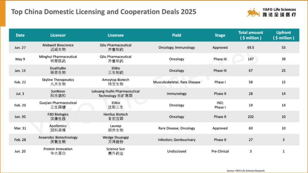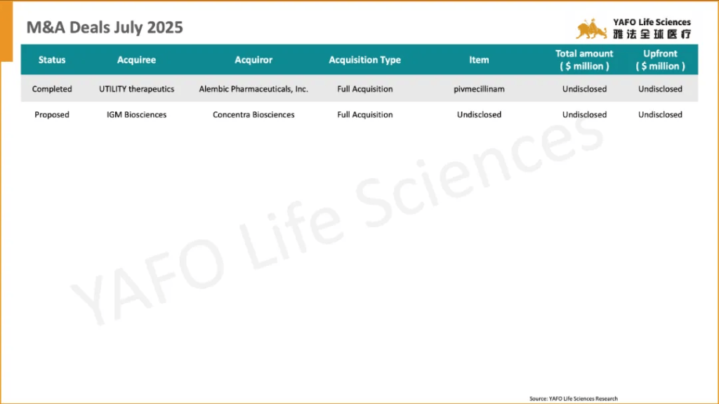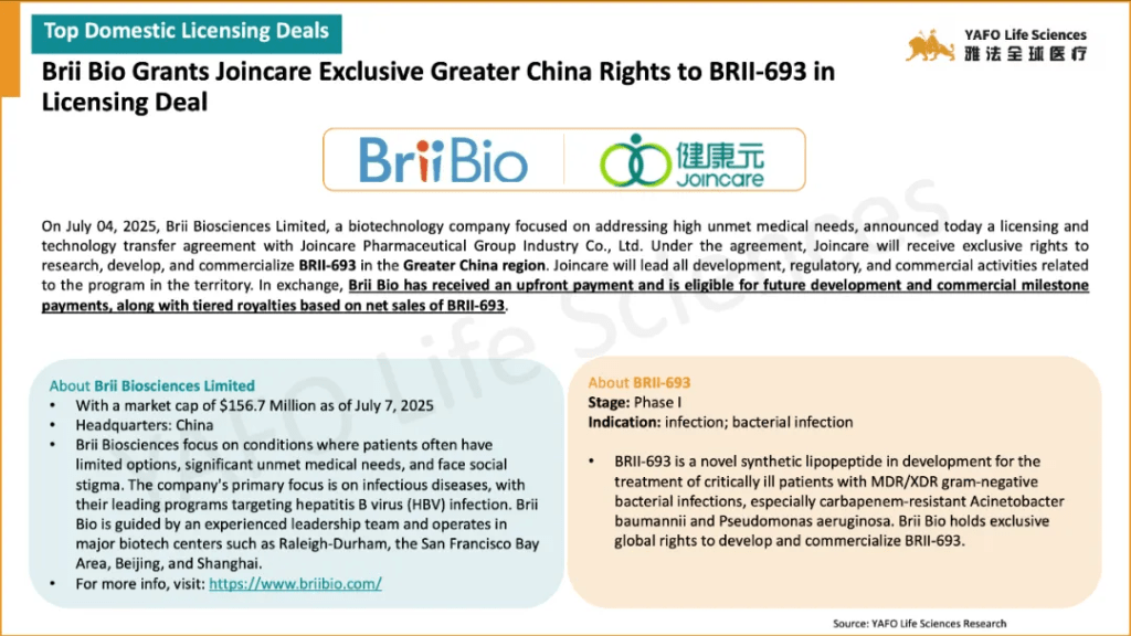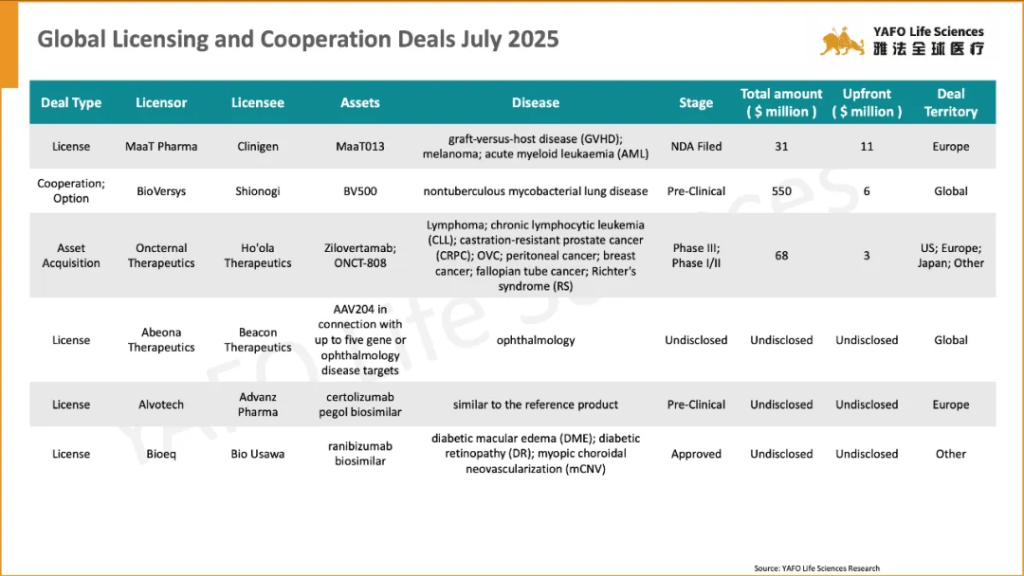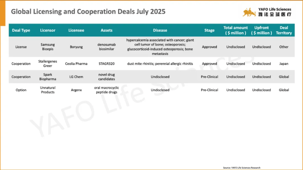 From July 1 to 4, a total of 13 biopharma agreements were signed globally. In the China biotech industry, there were 2 domestic deals and 1 out-licensing deal.