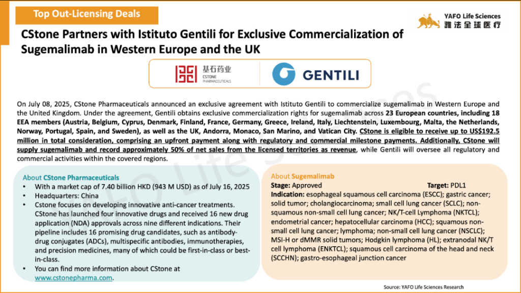 本周值得关注的出海交易是基石药业与IstitutoGentili就已获批资产舒格利单抗在西欧和英国达成独家战略合作,总金额可达1.925亿美元。