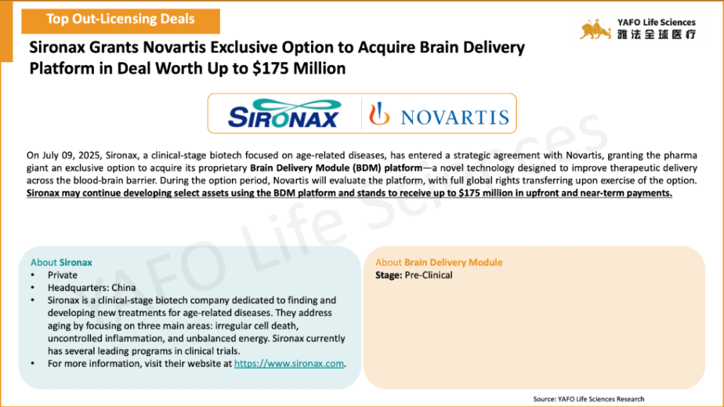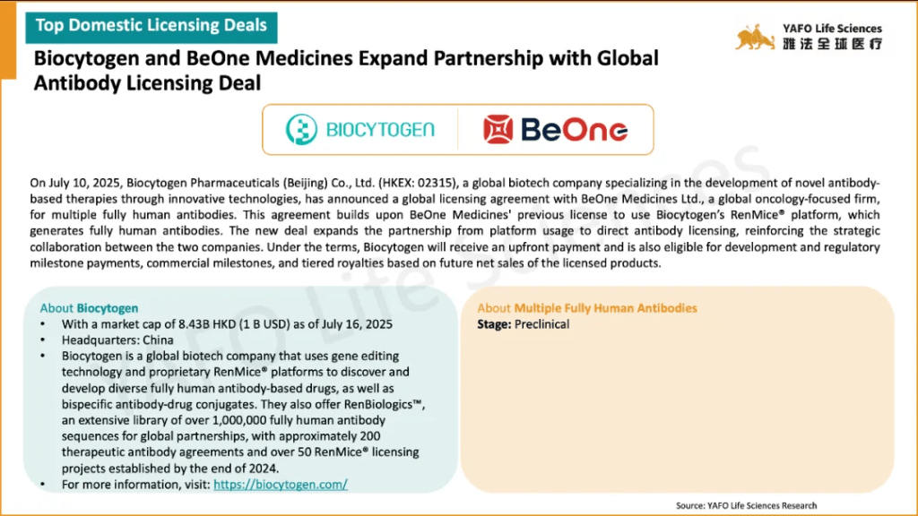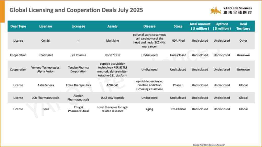 From July 5 to 11, a total of 17 agreements were signed globally. Within the China Biotech industry, there were three out-licensing deals and three domestic deals.
