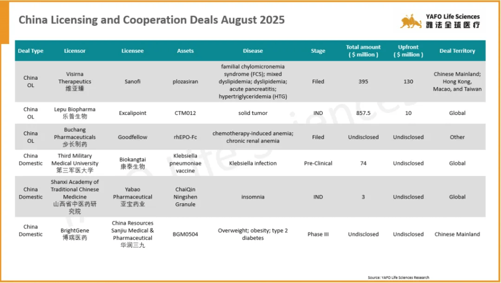 In China, the top deal in China was between Visirna Therapeutics and Sanofi for the Filed asset Plozasiran, with a total deal value of $395 million and an upfront payment of $130 million.