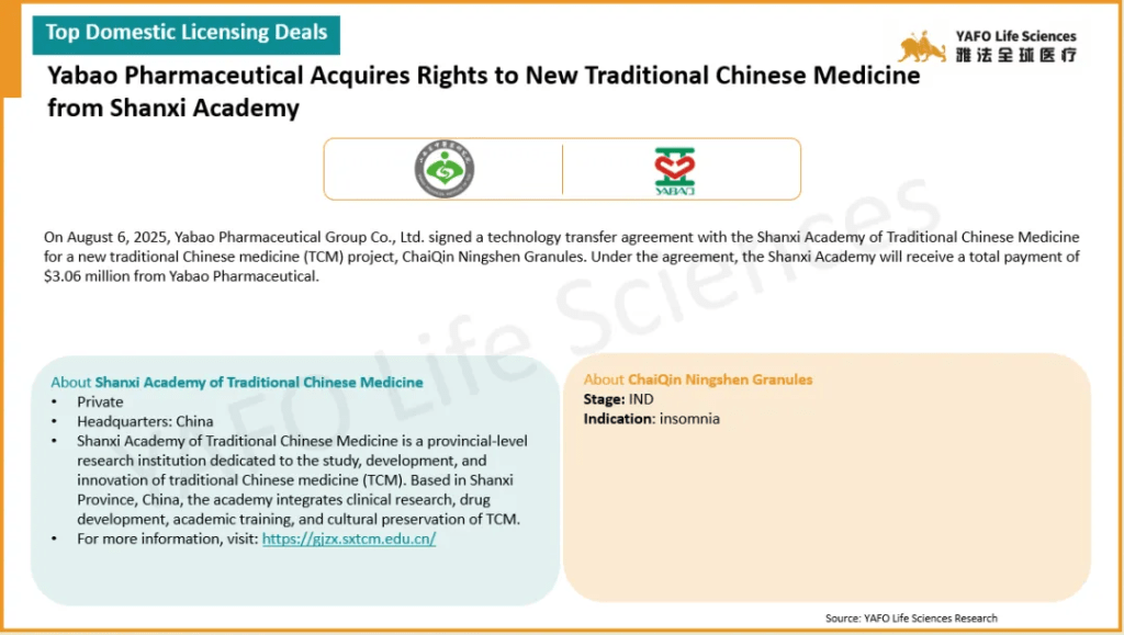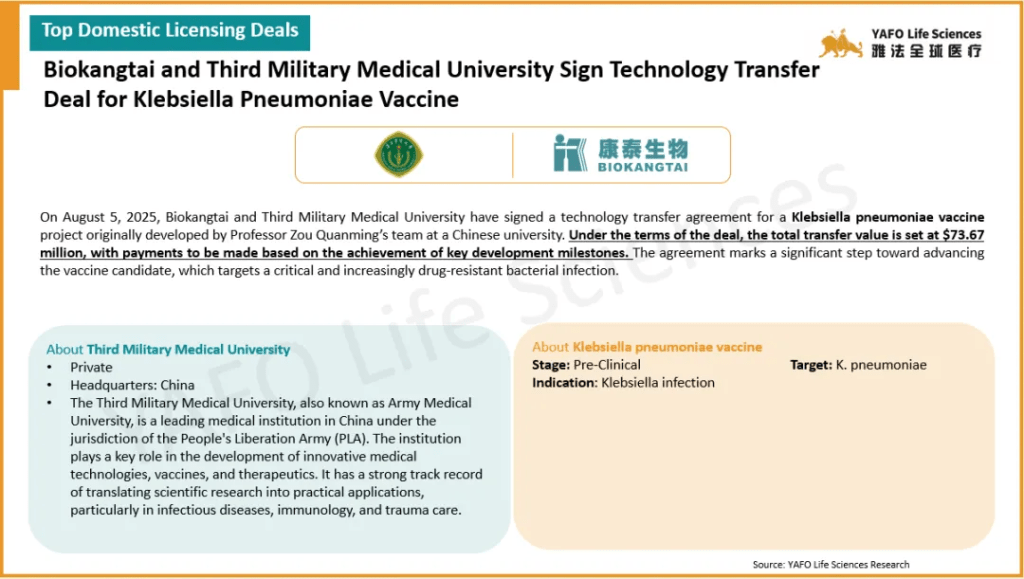 From August 1 to 8, a total of 12 agreements were signed globally. Within the China biotech industry, there were three out-licensing deals and three domestic deals.