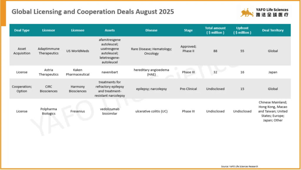 Globally, six deals were announced. The top global deal of the week was signed between Adaptimmune Therapeutics and US WorldMeds for the three TCR-T assets, with a total deal value of $88 million, including a $55 million upfront payment.