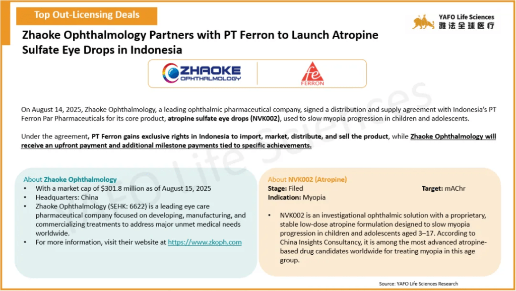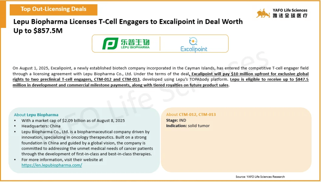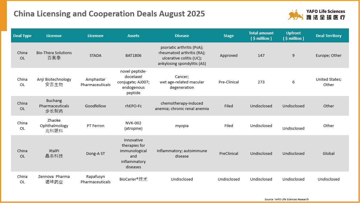 In August, a total of 68 biopharmaceutical agreements were announced globally. Within the China biotech industry, there were 12 out-licensing deals and 17 domestic partnerships. In China, the top out-licensing deal of the month was between BeOneMedicines and Royalty Pharma for an approved asset, Tarlatamab, with a total deal value of $950 million and an upfront payment of $885 million. Meanwhile, the leading domestic deal was signed between Yafei Biomedical (Affinity) and Anglikang Pharmaceutical for the IND asset IMD-1005, valued at $107 million with $21 million paid upfront. Globally, 39 cross-border deals were reported. The largest was a collaboration between Saniona and Jazz Pharmaceuticals for the Pre-Clinical asset SAN2355, with a total deal value of $1.04 billion and an upfront payment of $42.5 million.