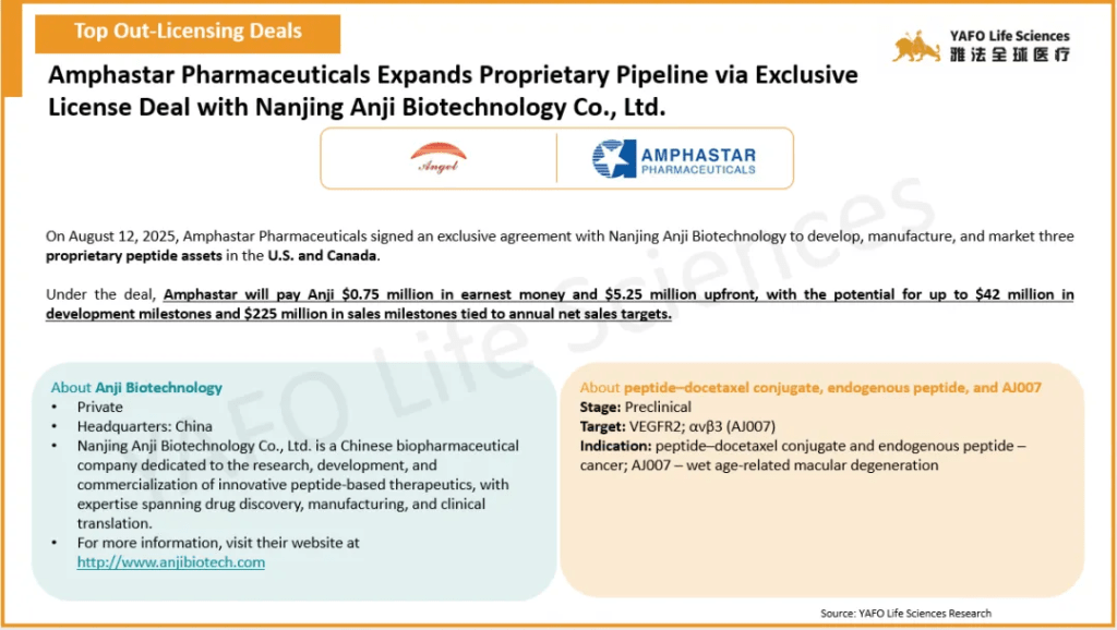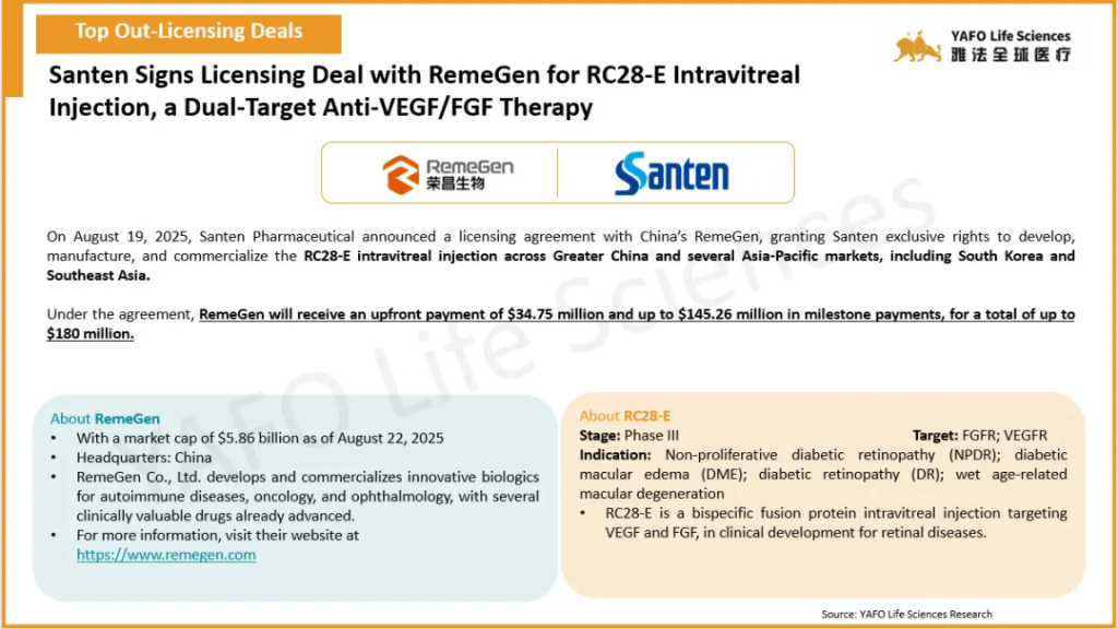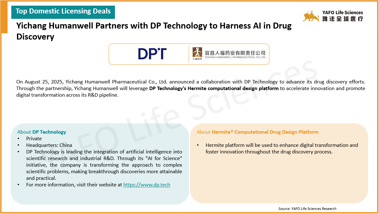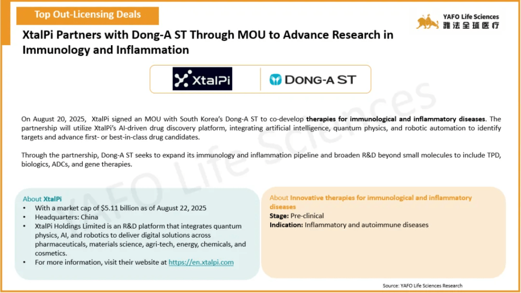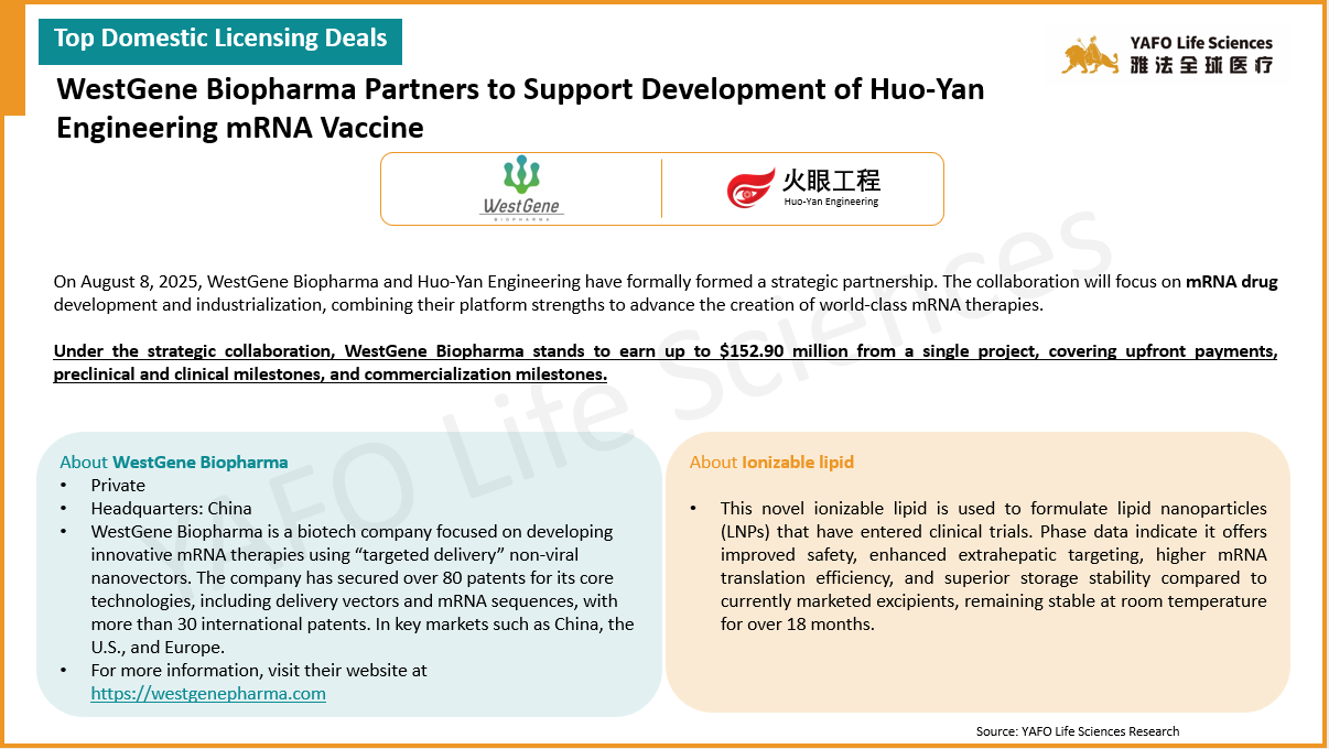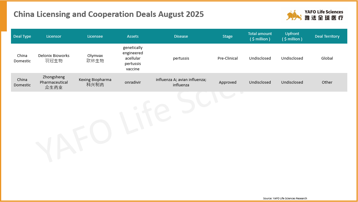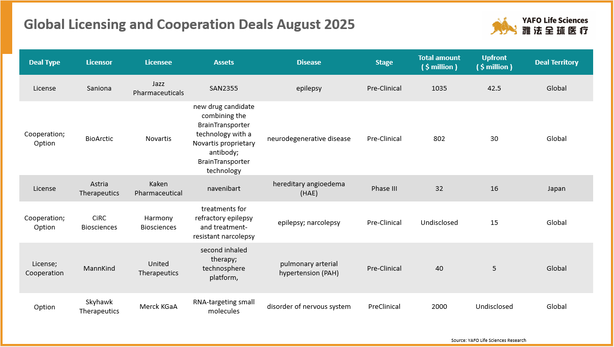 2025年8月,全球医药市场共签署了68项资产授权和合作协议。中国市场共达成29项交易,包括12项出海交易和17项国内交易。国内市场上,本月最大的出海交易是百济神州向Royalty Pharma出售就已获批资产Tarlatamab在中国以外的全球销售额收取特许权使用费的权利,首付8.85亿美元,总金额可达9.5亿美元。本月最大的国内交易是昂立康制药与亚飞生物(亲合力)就IND资产IMD-1005达成授权许可,首付款2100万美元,总金额可达1.07亿美元。国际市场上,本周共签署了39项资产授权和合作协议。最大的一项交易是Jazz Pharmaceuticals从Saniona引进临床前资产SAN2355,首付款4250万美元,总金额可达10.4亿美元。
