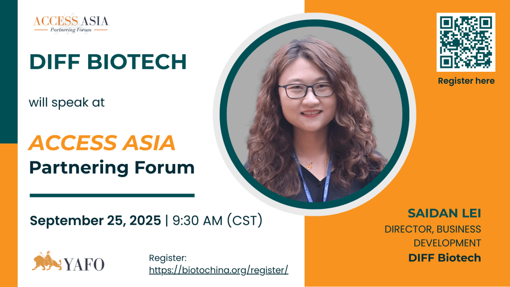 September 25, 2025 (9:30 AM CST) — We’re pleased to announce that Saidan Lei, Director, Business Development of DIFF Biotech, will present at the ACCESS Asia Partnering Forum Online Showcase. ACCESS Asia builds on the success of ACCESS China, expanding Asia’s leading cross-border biotech platform to connect innovators with global pharma, investors, and partners