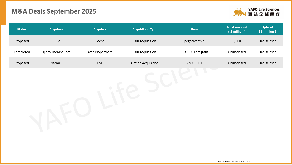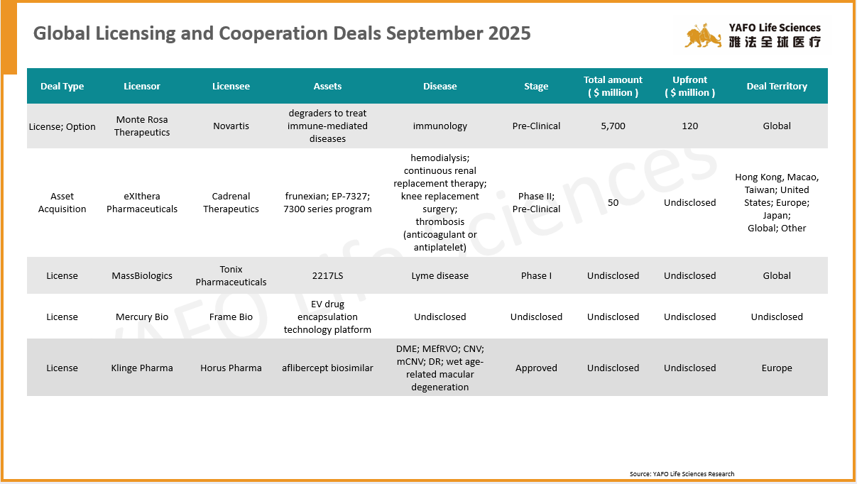 From September 13 to 19, a total of 17 agreements were signed globally. Within the China biotech industry, there was one in-licensing deal, four out-licensing deals, and three domestic deals.