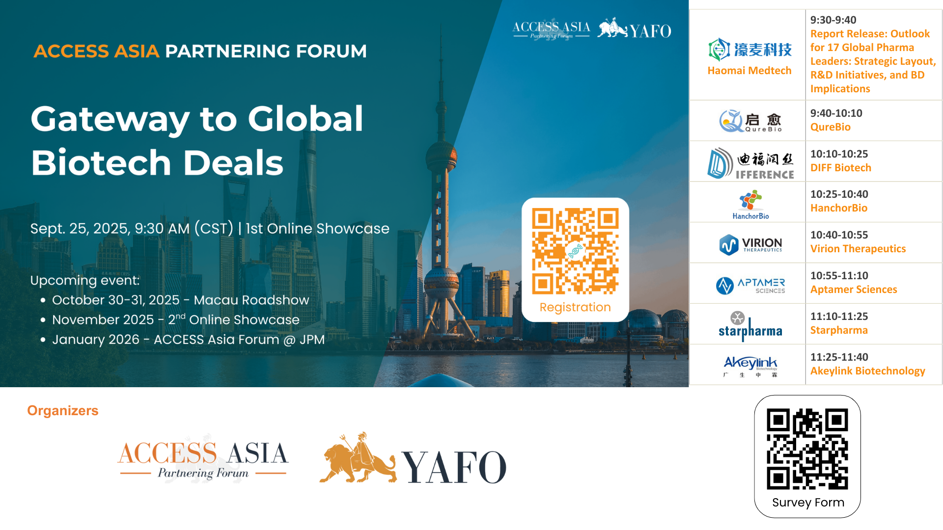 On September 25, 2025, the ACCESS Asia Partnering Forum successfully launched its first online showcase: ACCESS Asia Partnering Forum (YAFO) – 100 Innovators to Watch. ACCESS Asia serves as a bridge between the region’s most promising biotech companies and international pharma, investors, and strategic partners. Through digital showcases, live roadshows, and dedicated partnering events at JPM Week and the BIO International Convention, ACCESS Asia brings Asia’s fastest-growing biotech pipelines onto the global stage.