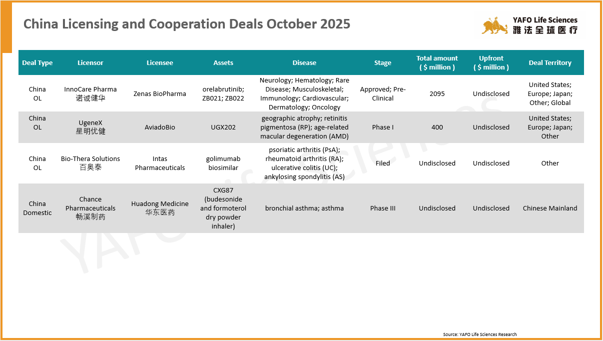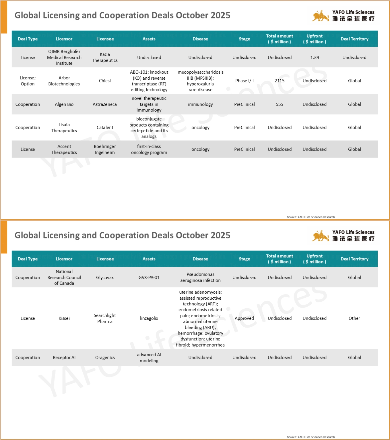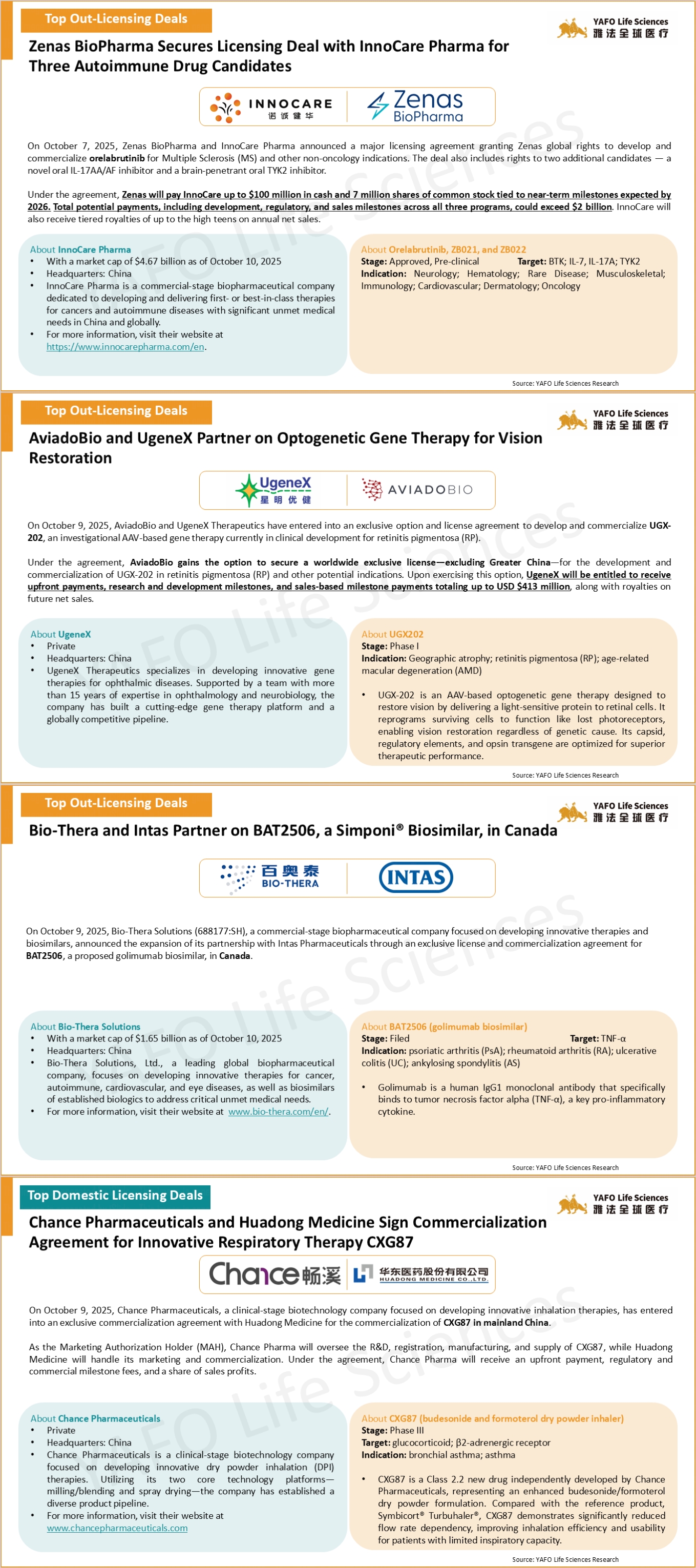 From October 1 to 10, a total of 12 agreements were signed worldwide. Within China’s biotech industry, there were three out-licensing deals and one domestic deal.