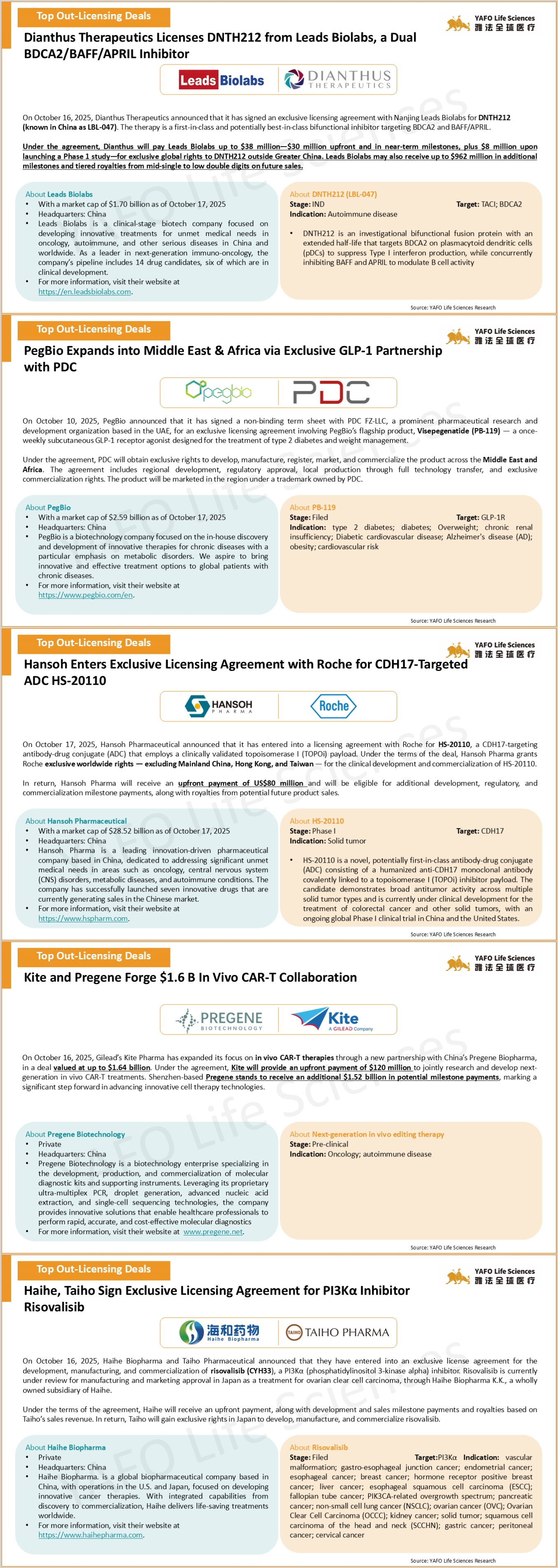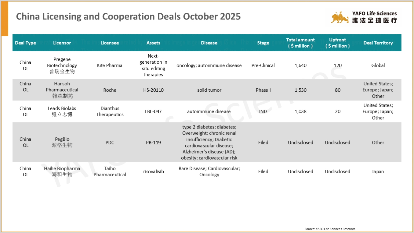 From October 10 to 17, a total of 15 agreements were signed worldwide. Within China’s biotech industry, there were five out-licensing deals.