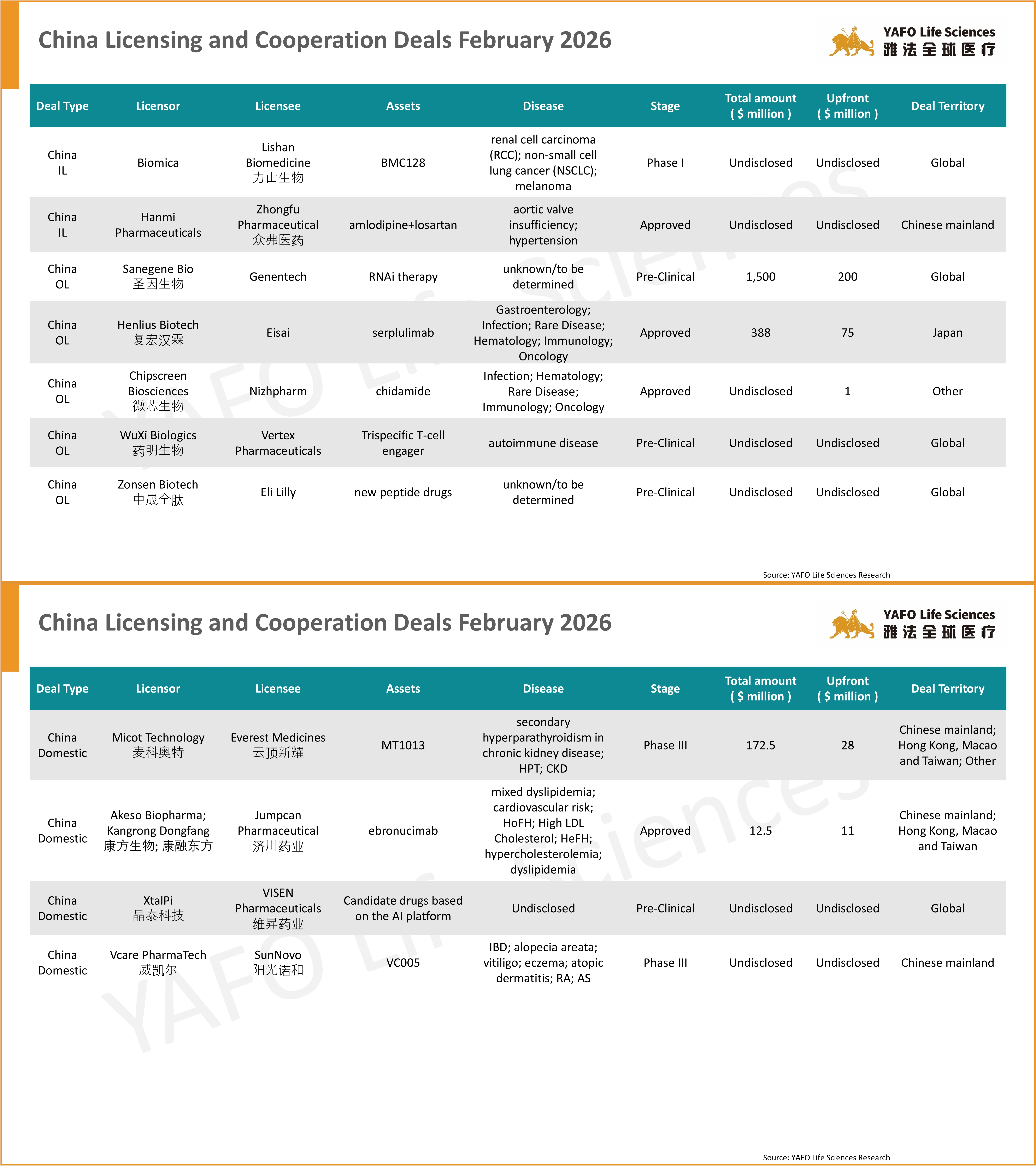 Founded in 2013, YAFO Capital is a Shanghai-based boutique investment and advisory firm, with a professional team in our China, U.S., EU, and SEA offices. Partnering with Pharmaceutical companies, YAFO Fund mainly invests in global assets. YAFO Life Sciences is a leading advisory boutique focused on asset transactions. YAFO has built a strong, proven track record and closed dozens of in-licensing and out-licensing transactions with global pharma and biotech companies. Over the past five years, YAFO has been ranked as the No. 1 advisor for China cross-border licensing transactions. For more information, please visit http://www.yafocapital.com
