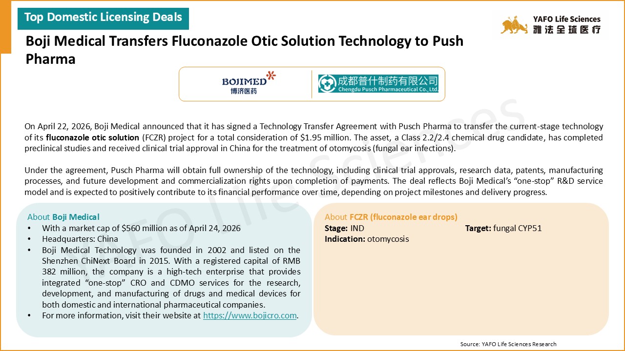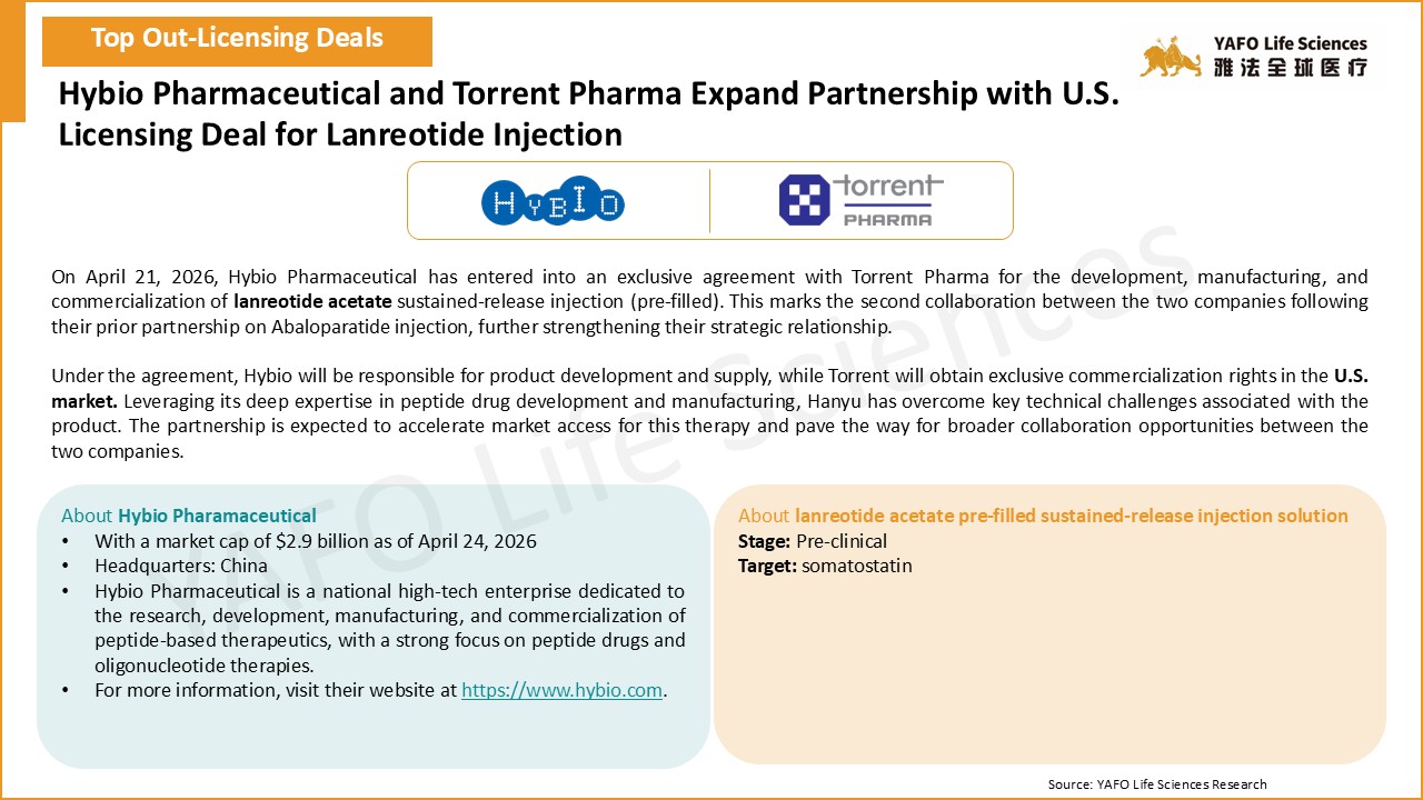 From April 18 to 24, a total of 15 agreements were signed worldwide. Within China’s biotech industry, there were three out-licensing deals, one in-licensing deal, and one domestic transaction.