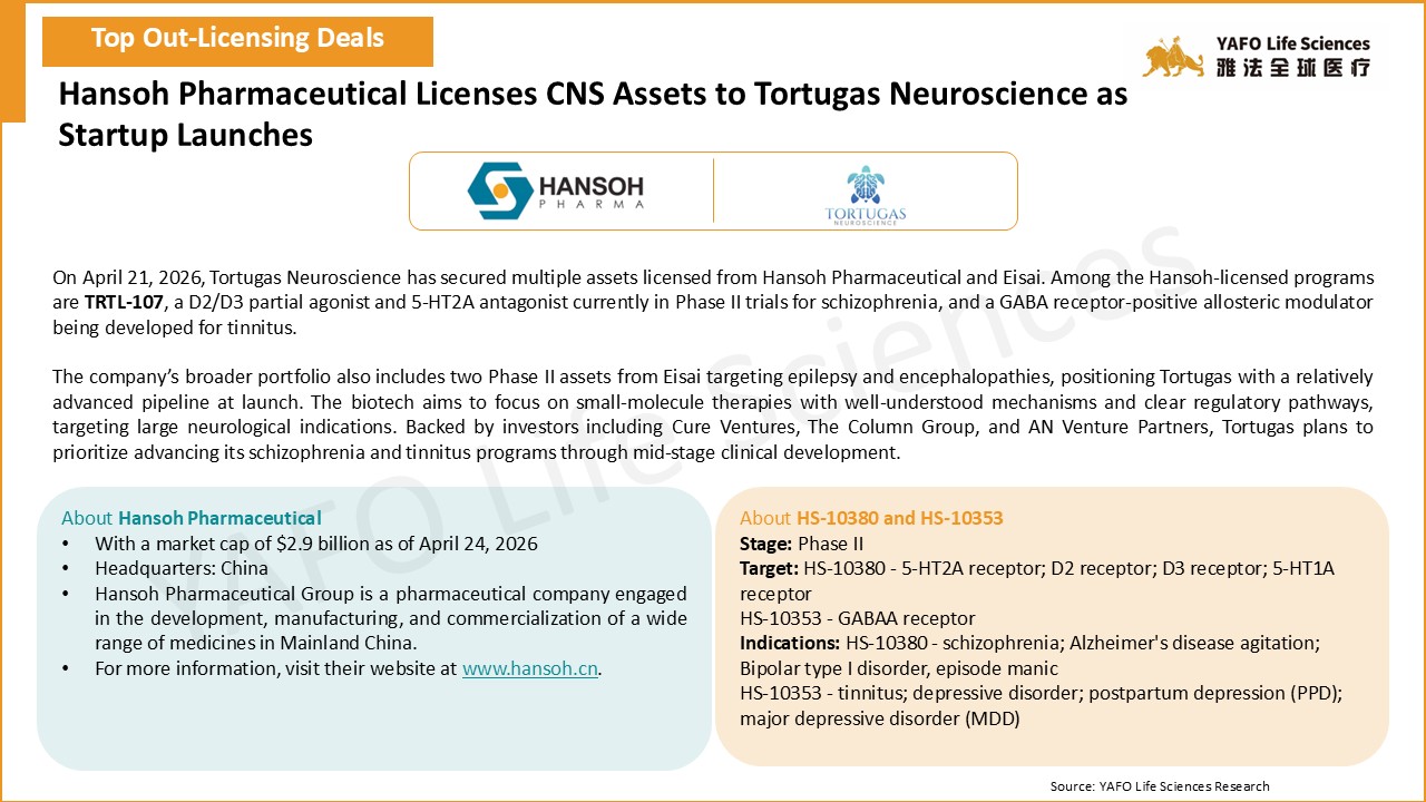 Tortugas Neuroscience | HS-10380; HS-10353 | schizophrenia; Alzheimer’s agitation; bipolar I; tinnitus; depressive disorder; PPD; MDD | Phase II | Undisclosed | Undisclosed | Global |