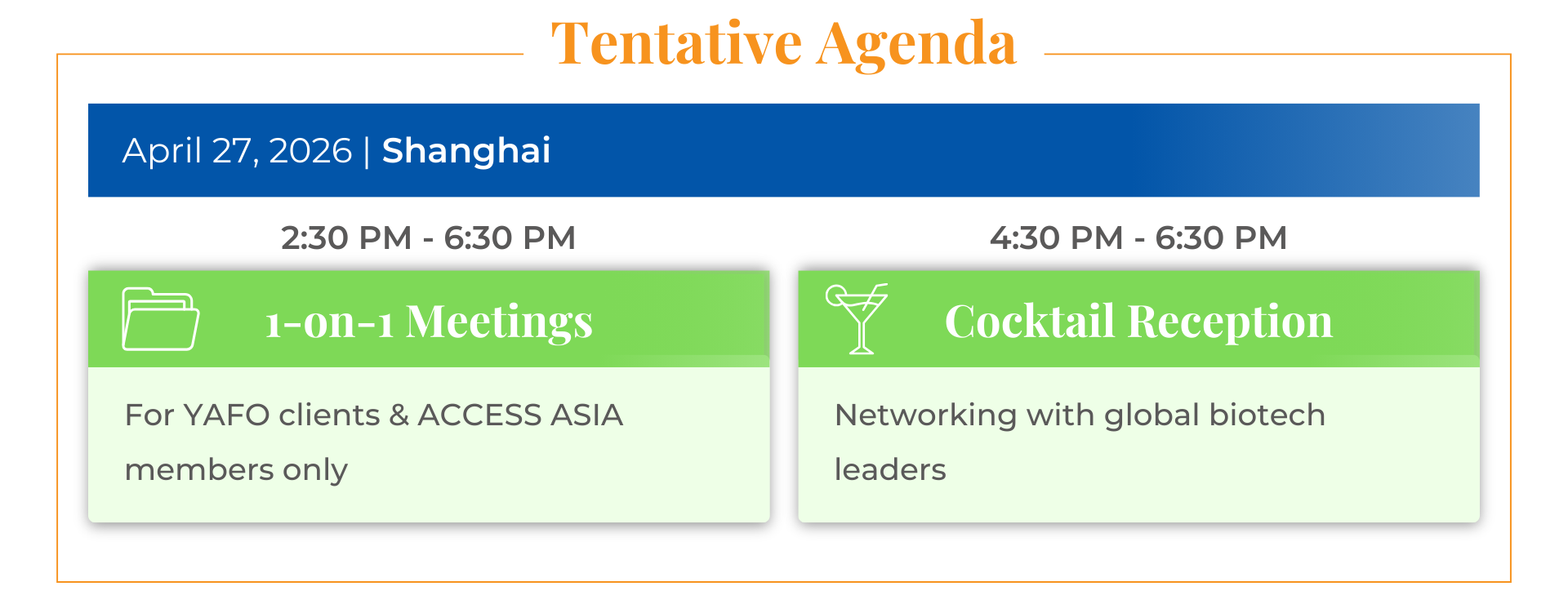 Founded in 2013, YAFO Capital is a global boutique investment and BD advisory firm with professional teams across our offices in China, the U.S., Europe, and Southeast Asia. Our expertise spans four core business segments: transaction advisory and consulting, NewCo incubation, investment fund management, and partnering forums. Over the years, YAFO has built a strong track record, closing dozens of business development transactions with leading global pharmaceutical and biotech companies. For more information, please visit http://www.yafocapital.com.