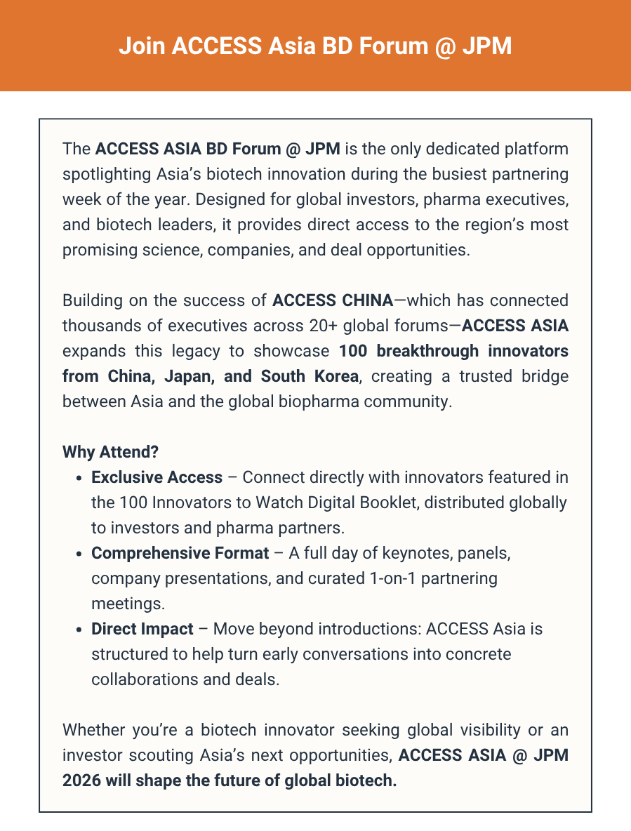 Even if your participation plans are still being finalized, attending the ACCESS ASIA BD Forum @ JPM 2026 offers access to insights directly from emerging innovators. All attendees will be able to review available assets via the shared link.